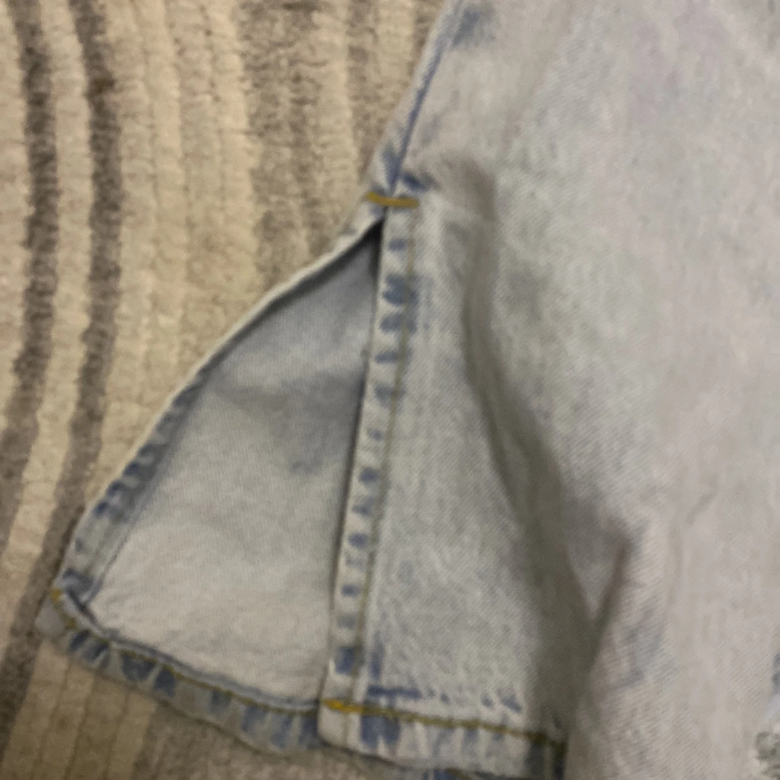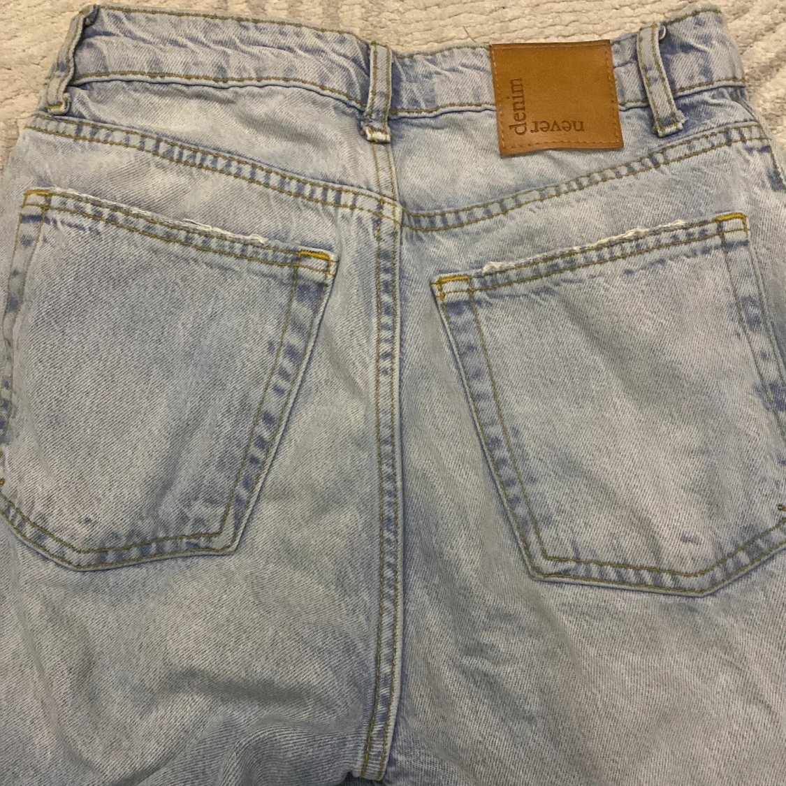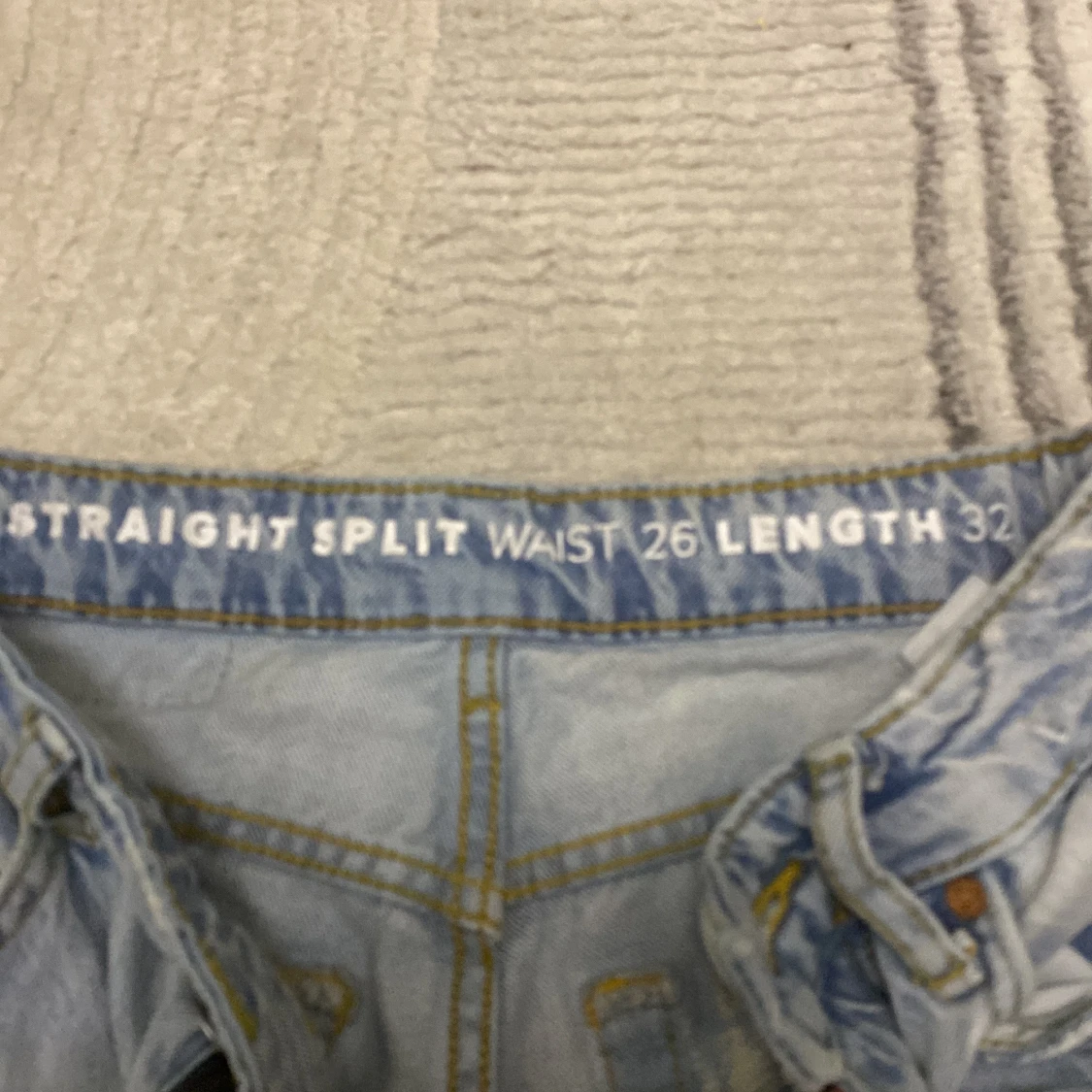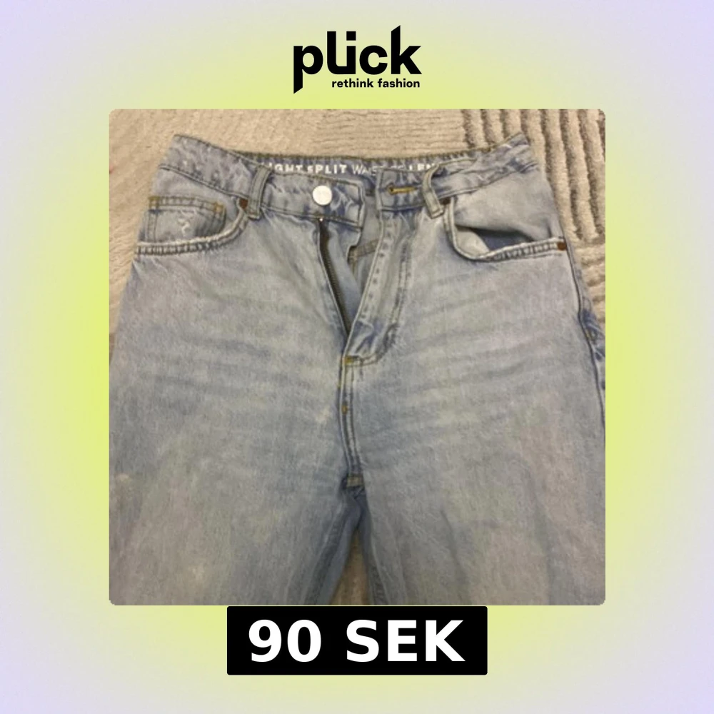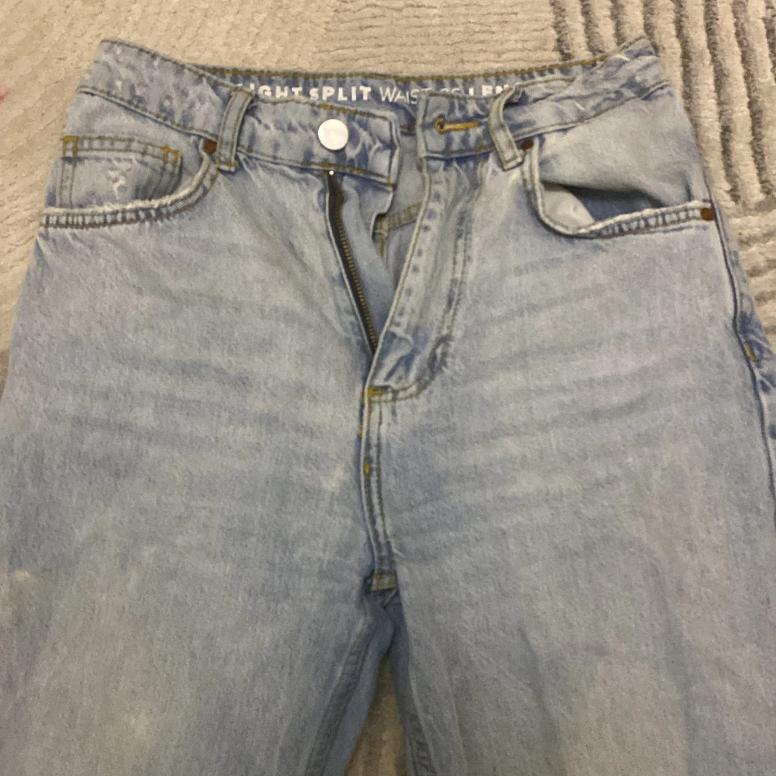 Säljer ett par ljusblå jeans från Urban Outfitters med straight split-modell. Byxorna har hög midja, klassiska fem fickor och en snygg slits nertill på benen. Tillverkade i jeansmaterial med kontrastsömmar och läderpatch bak.