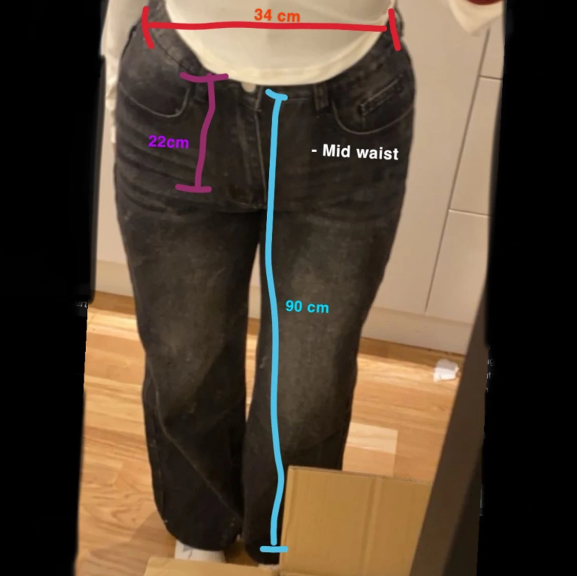 Säljer då dem inte sitter lika fint på mig som de brukade göra 🤍 Köpt för 499 säljer för 349 (första bilden är lånad men andra och tredje är mina egna) - Den är 90 cm lång och går över mina skor för mig som är 162 - Midjan är 34 tvärs över över🤍
