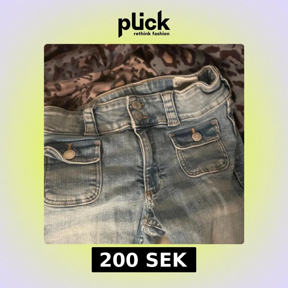 Säljer ett par ljusblå jeans med bootcut-modell och snygga fickor framtill med lock och knappar. Jeansen har dubbla knappar i midjan och är lågmidjade. Dm om ni vill ha bild på! De är från HM och är i mycket bra skick!