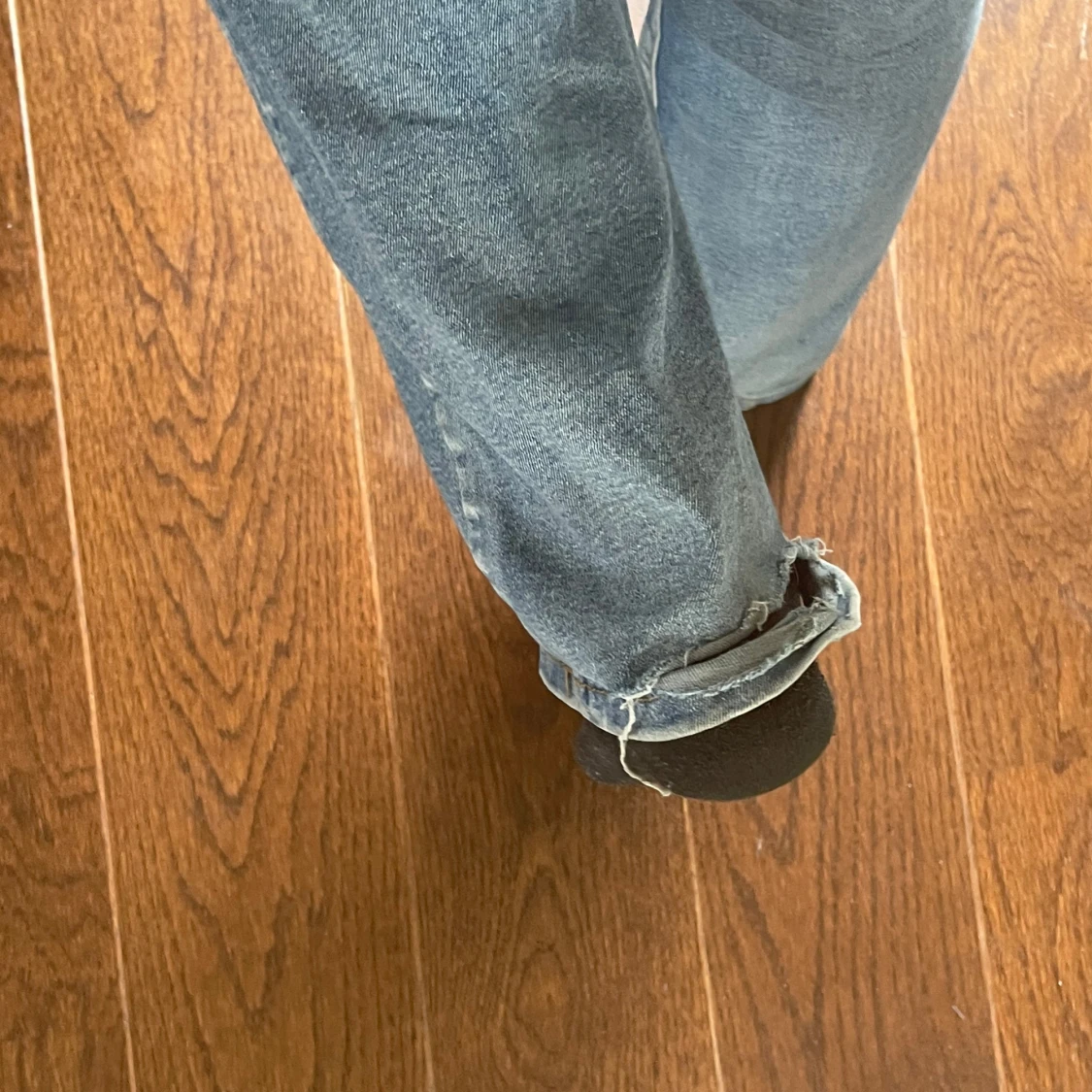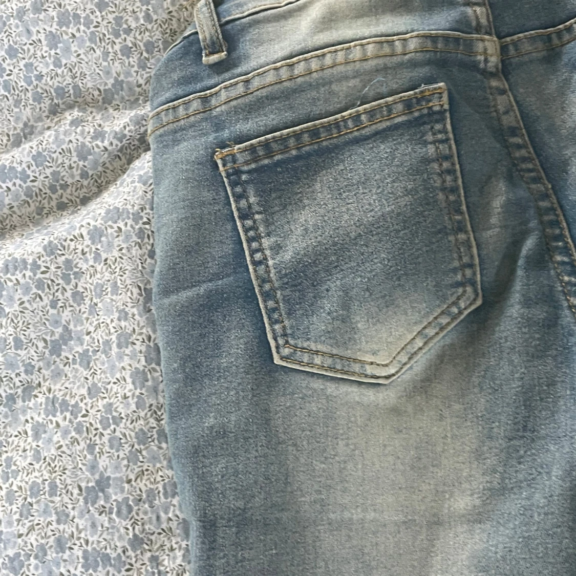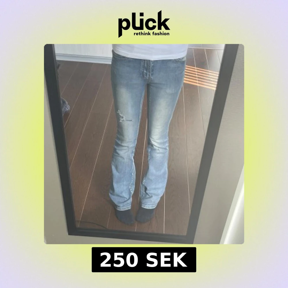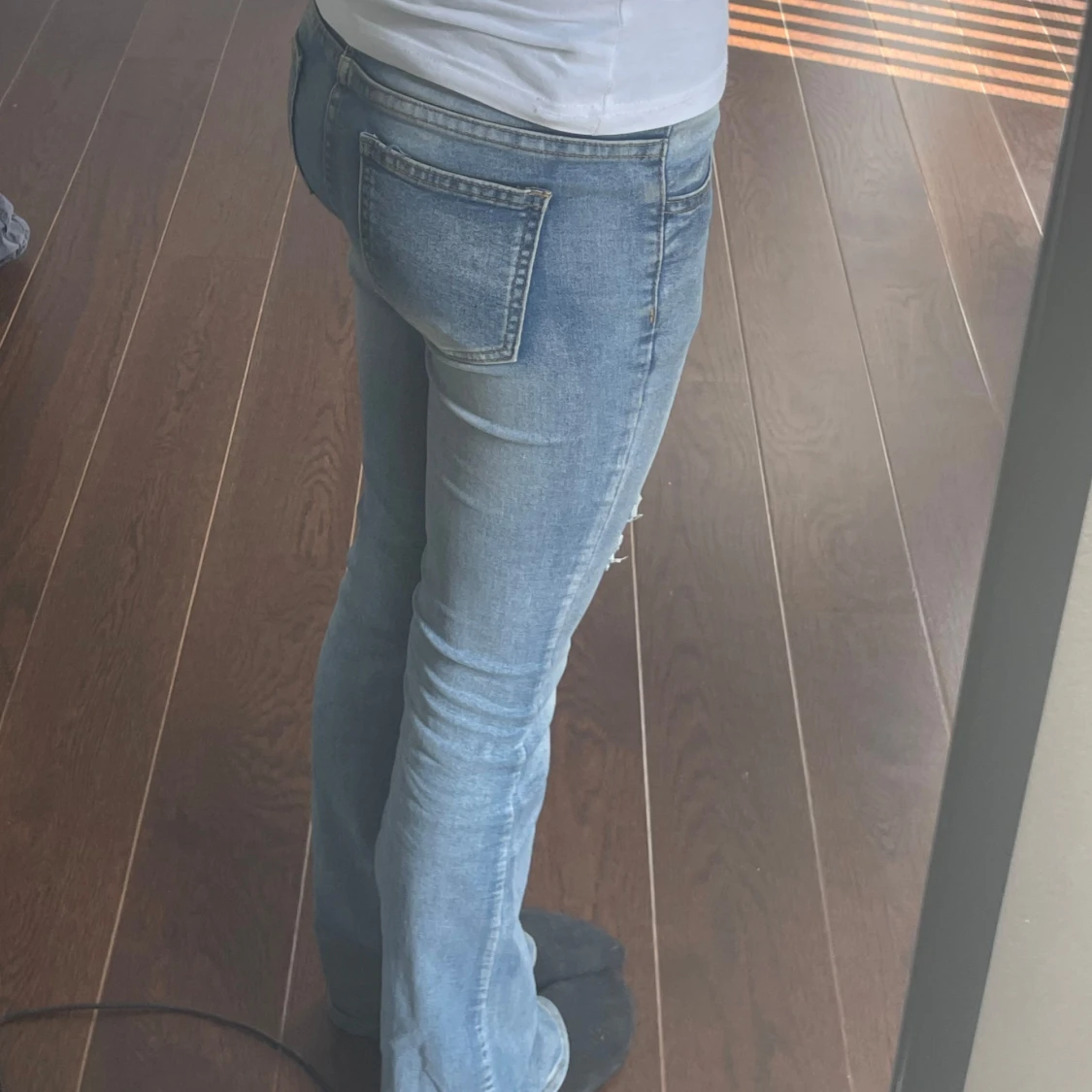 Säljer ett par blå bootcut jeans med slitningar på låret och lätt urtvättad look. Är dåligt längst ner på ena benet då de har varit för långa och jag trampar på de