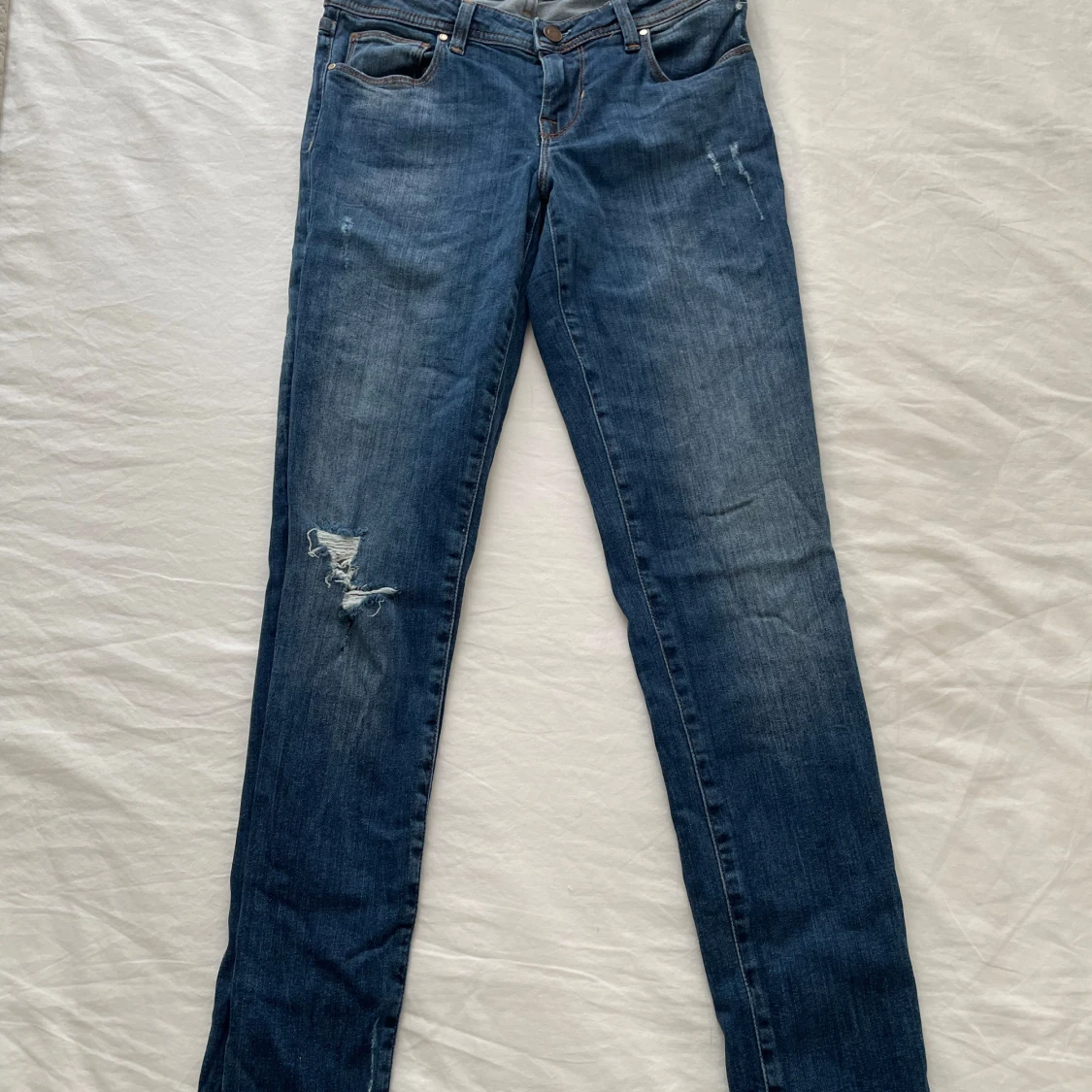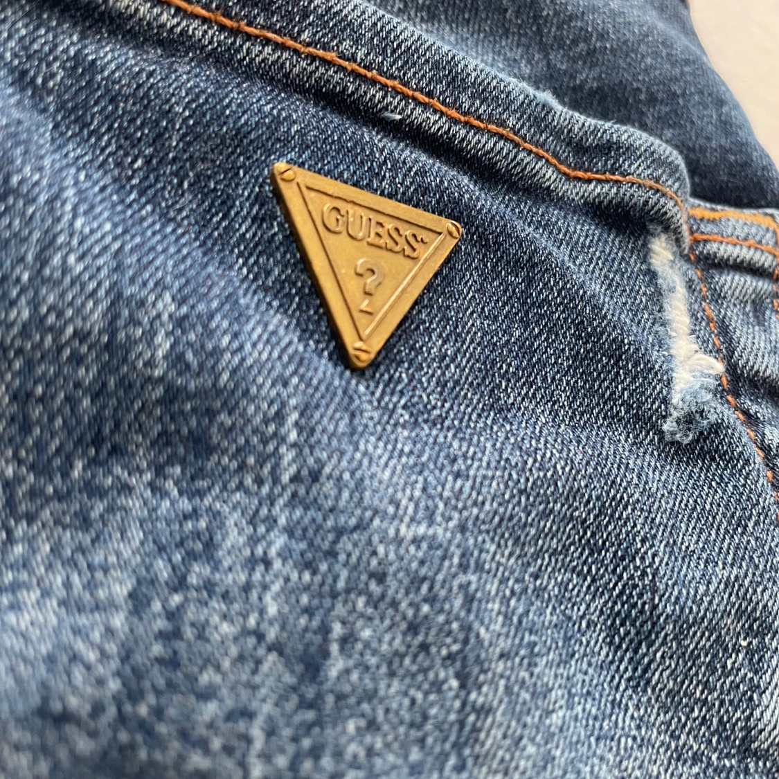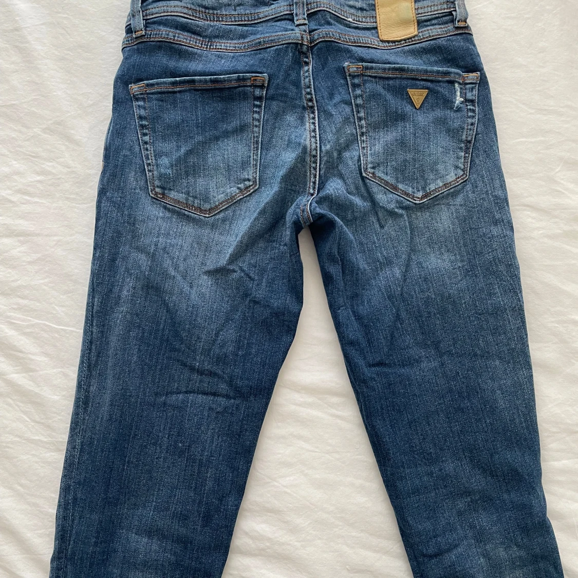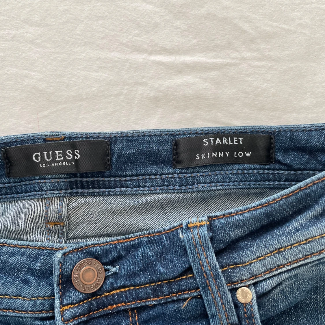 Snygga blå jeans från Guess i modellen Starlet. De har en skinny passform och är lågmidjade. Jeansen har en cool slitning på ena benet och klassiska femficksdetaljer. Perfekta för en avslappnad stil.