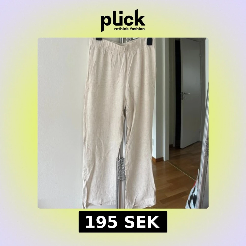 Säljer ett par beiga linnebyxor i linneblandning med avslappnad passform och elastisk midja. Byxorna är raka i modellen och har en naturlig, lite grov struktur i tyget. Perfekta för varma dagar och en chill stil.