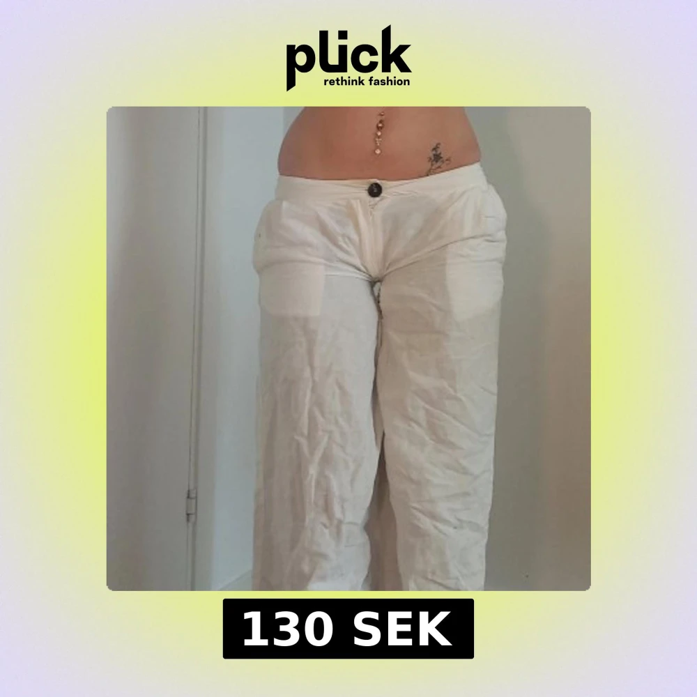 Säljer ett par vita linnebyxor med mid/low waist. Byxorna har raka men pösiga ben och stängs med knapp och dragkedja framtill. Perfekta för varma dagar och har en luftig känsla tack vare linnematerialet.