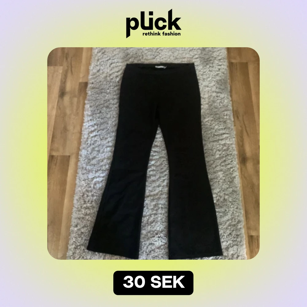 Fina svarta tyg byxor som svänger ut nere i benen. Använt 4 gånger. Har inga bilder på och kan tyvärr ej lösa då dom är för små.