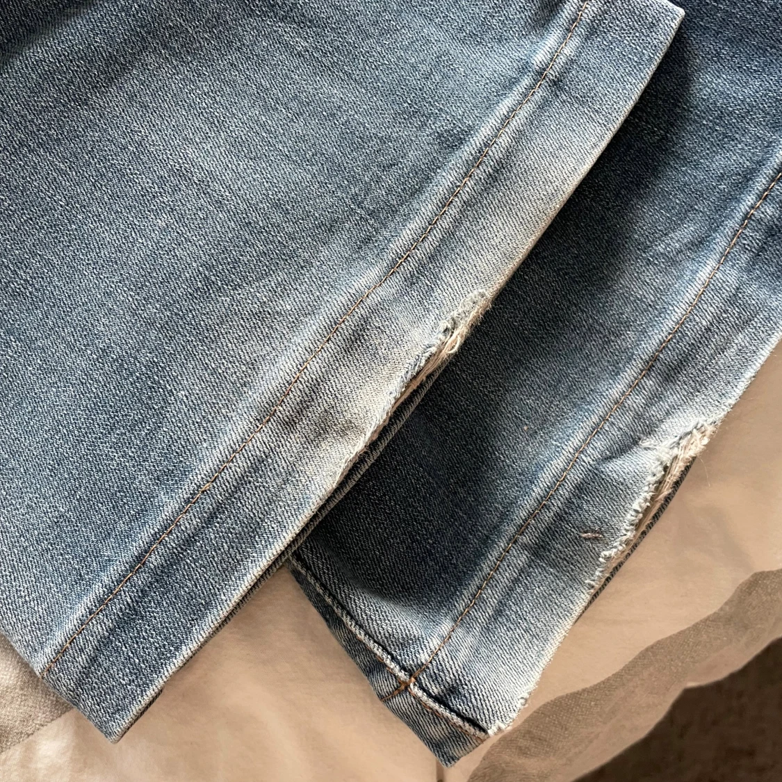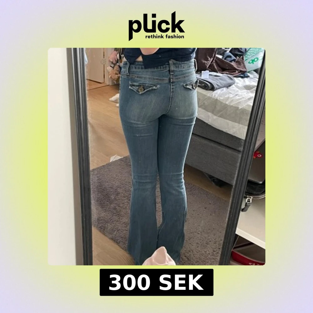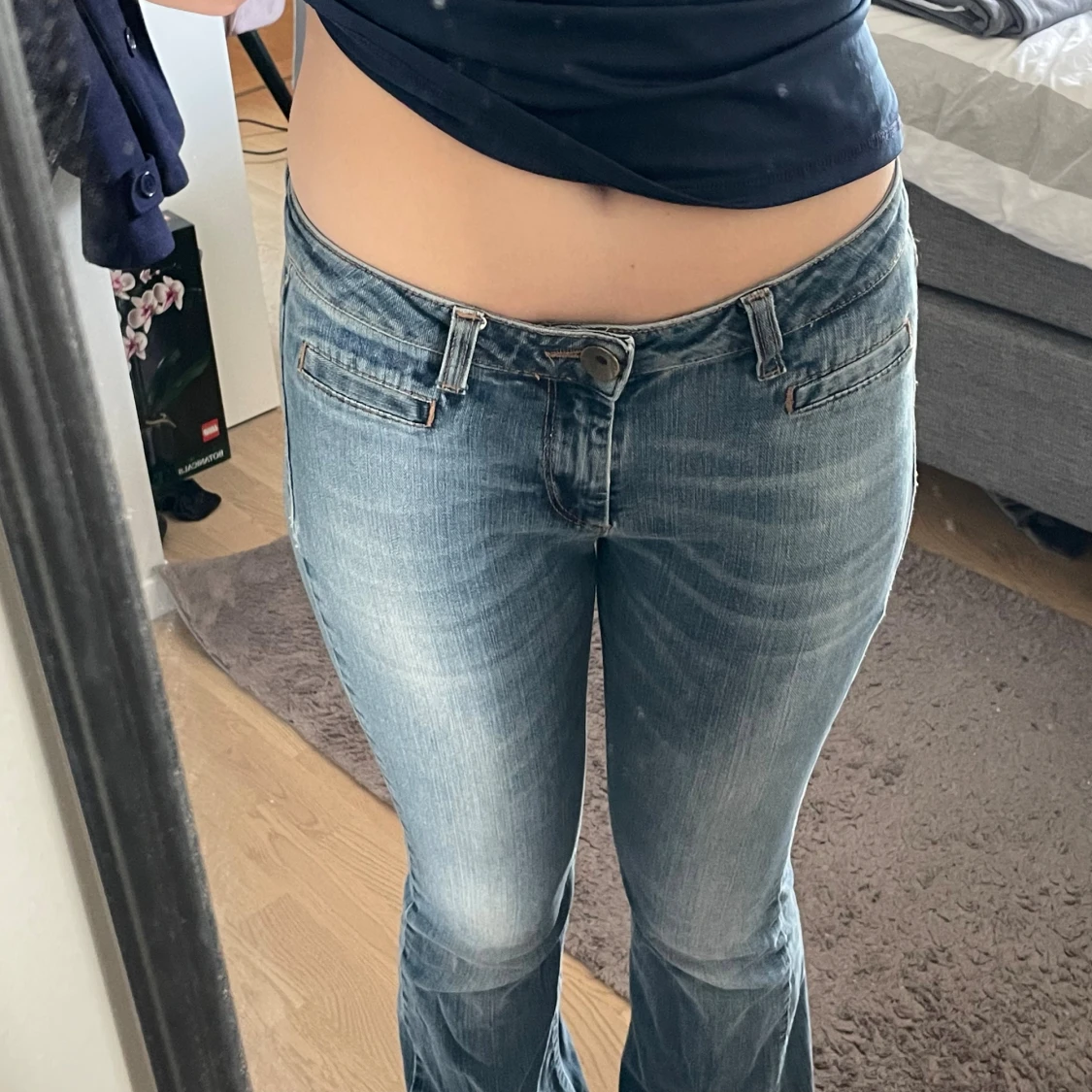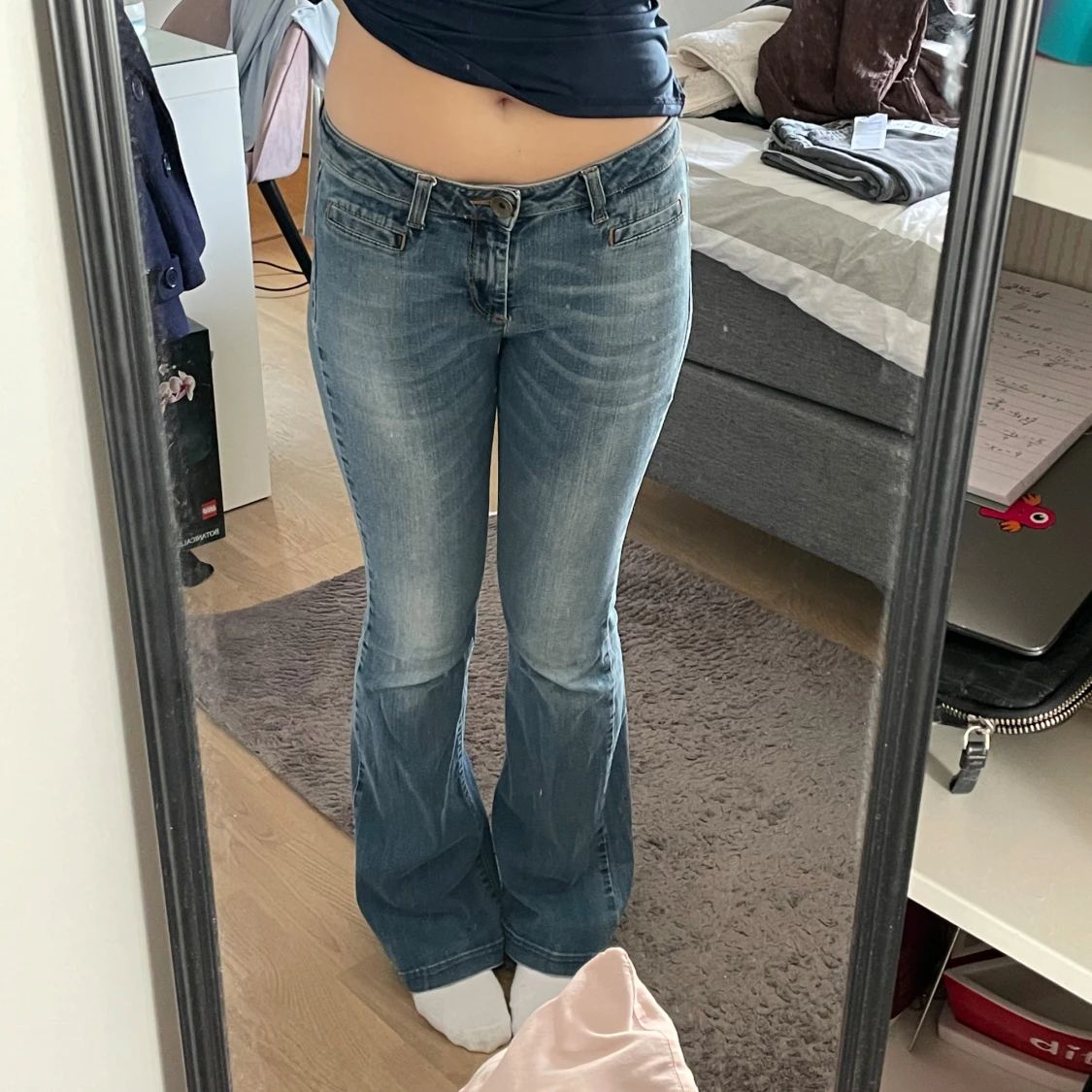 Skit snygga lågmidjade blå jeans med coola fickor bak! Passar mig som brukar ha S och är 171, kan passa någon lite längre också! De är lite slitna längst ner men det syns knappt! Står W27 L35 på lappen!