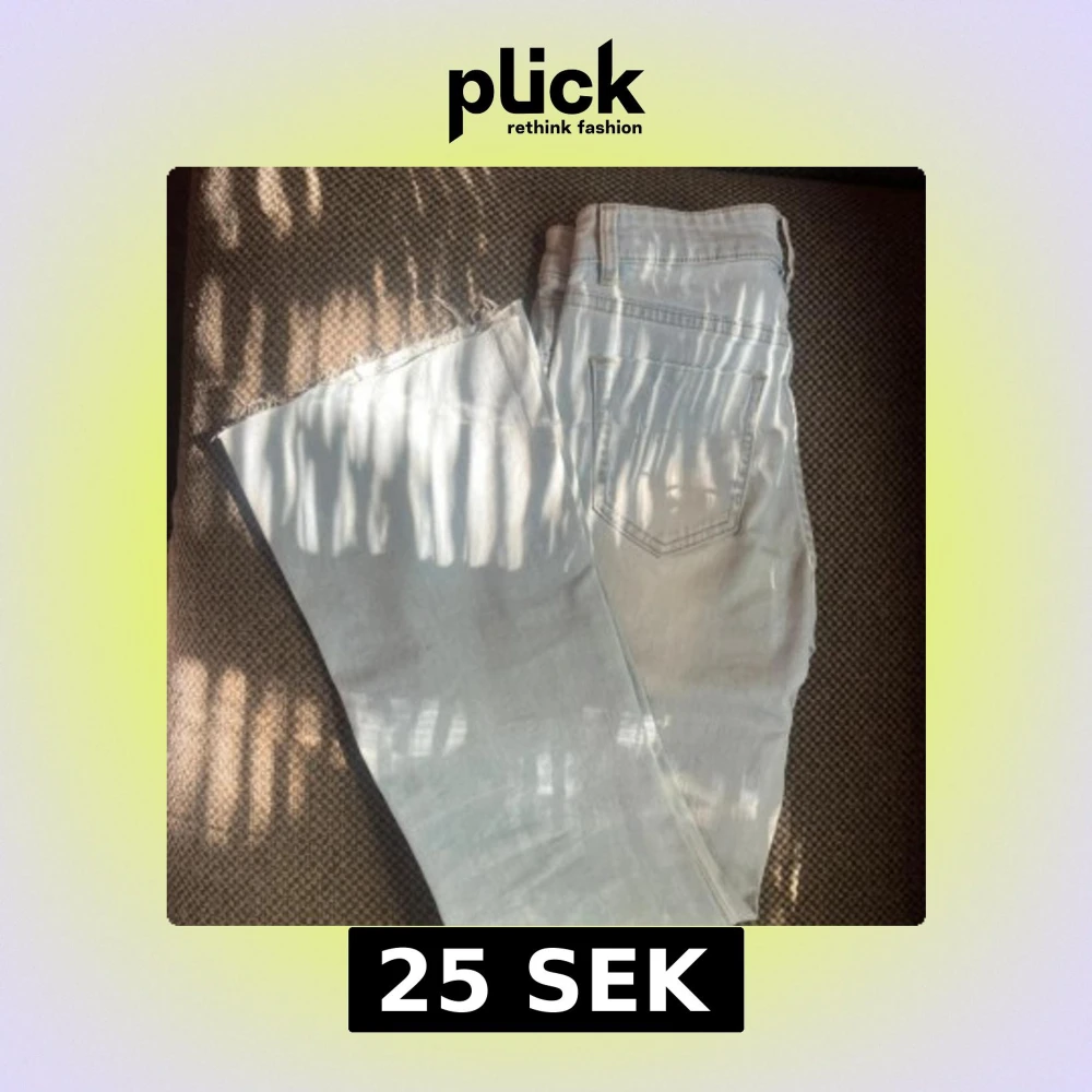 Säljer ett par ljusblå jeans med bootcut-modell och rå, avklippt kant nertill. Klassisk femficksdesign och bälteshällor. Jeansen har en snygg, ljus tvätt och är perfekta för dig som gillar en avslappnad men trendig look.