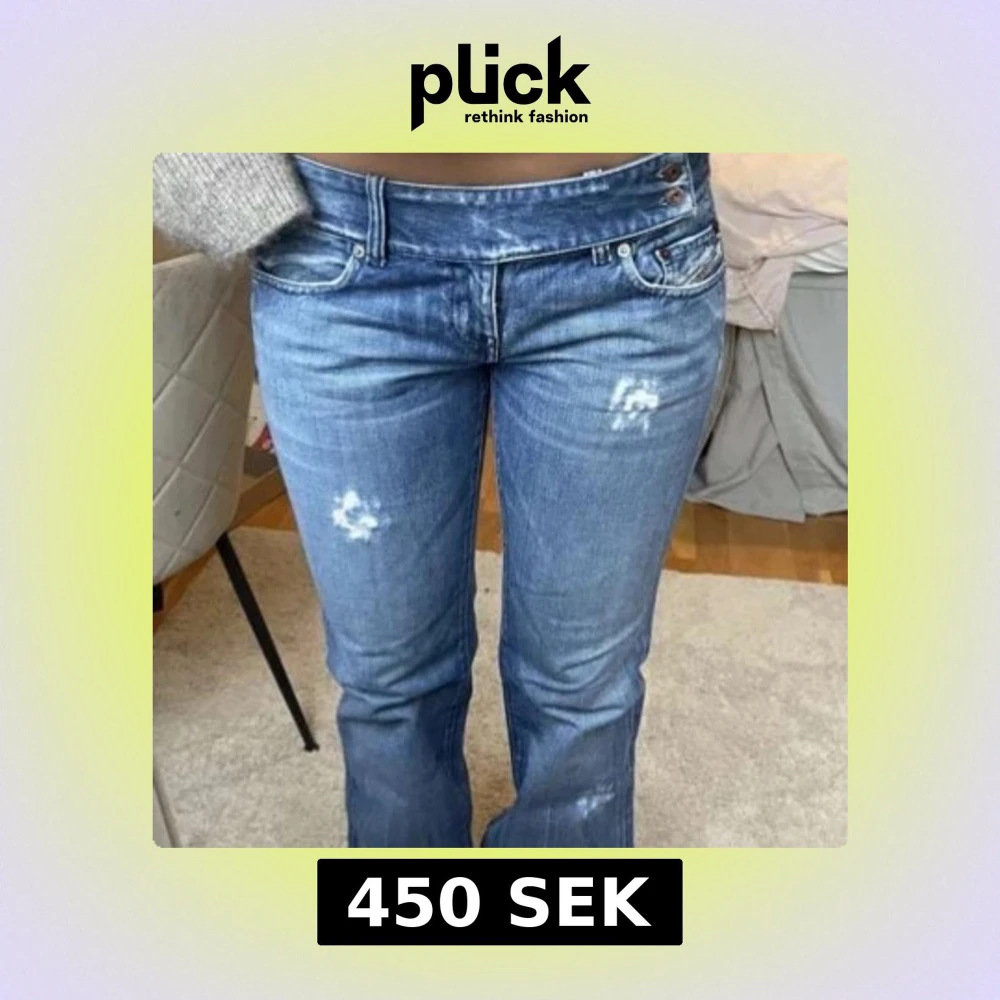 Snygga lågmidjade blå jeans med bootcut passform och slitna detaljer på benen. Jeansen har klassisk femficksdesign och knäppning med två synliga knappar. Perfekta för en avslappnad och trendig look.