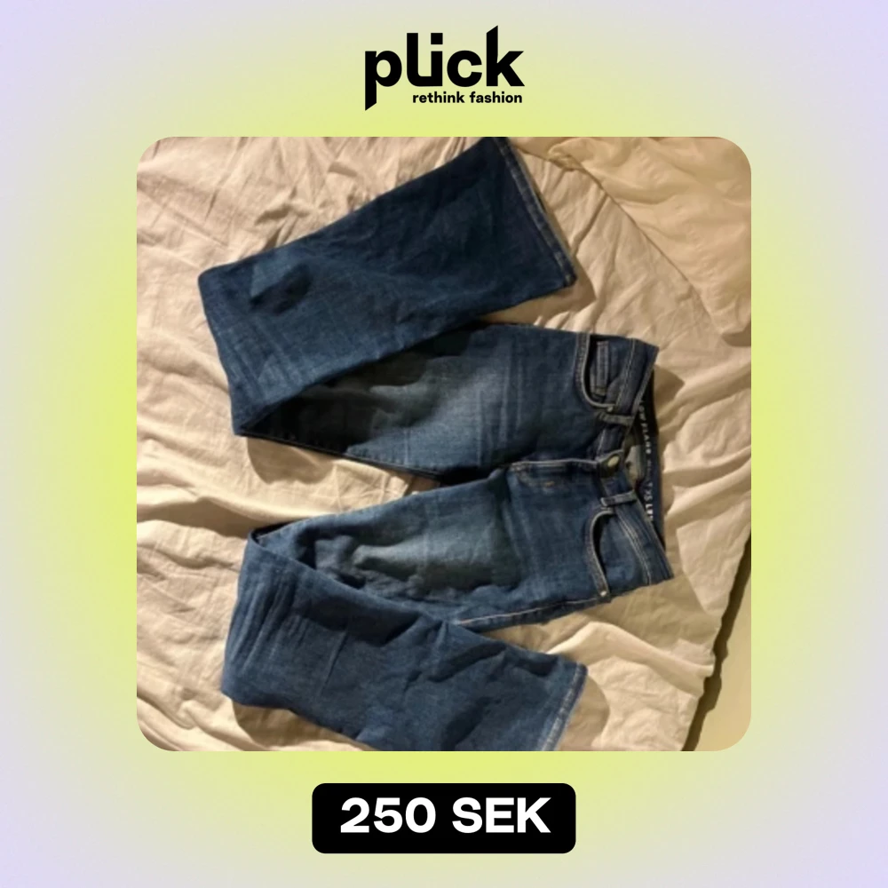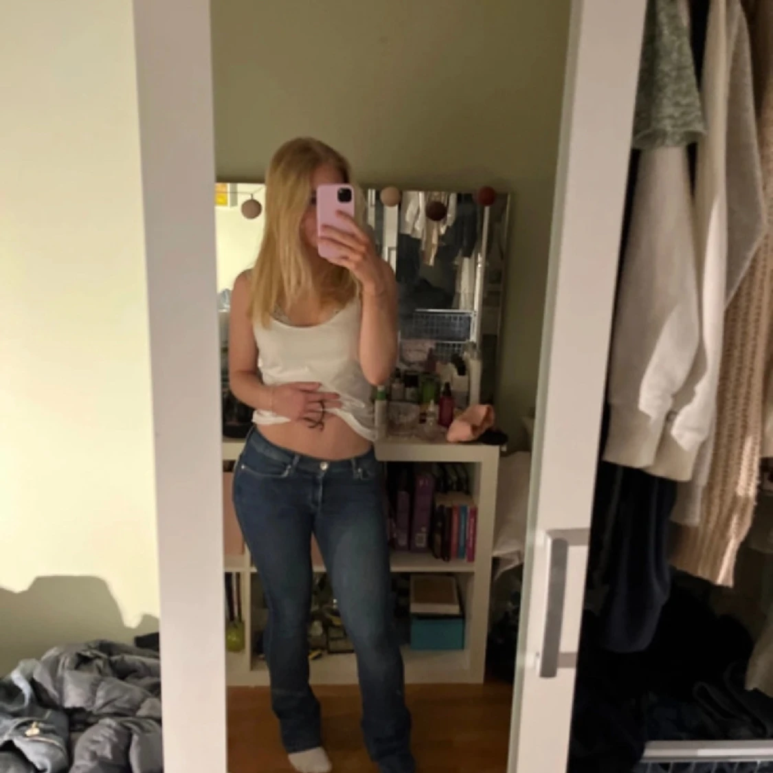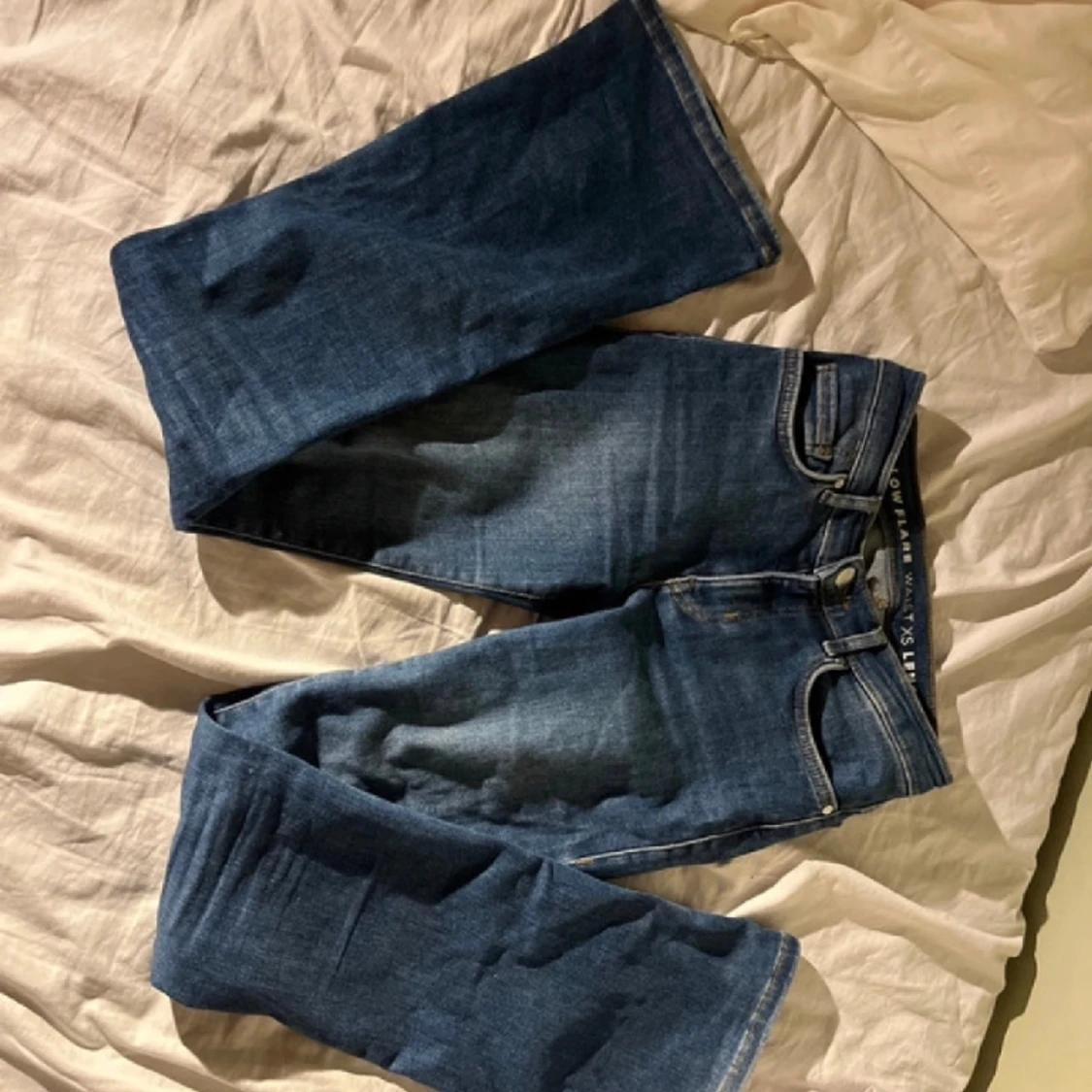 Mörkblå lågmidjade jeans i jätteskönt material. Model flare och knappt använda. Lite för långa för mig som är 164 cm lång. Nypris:500