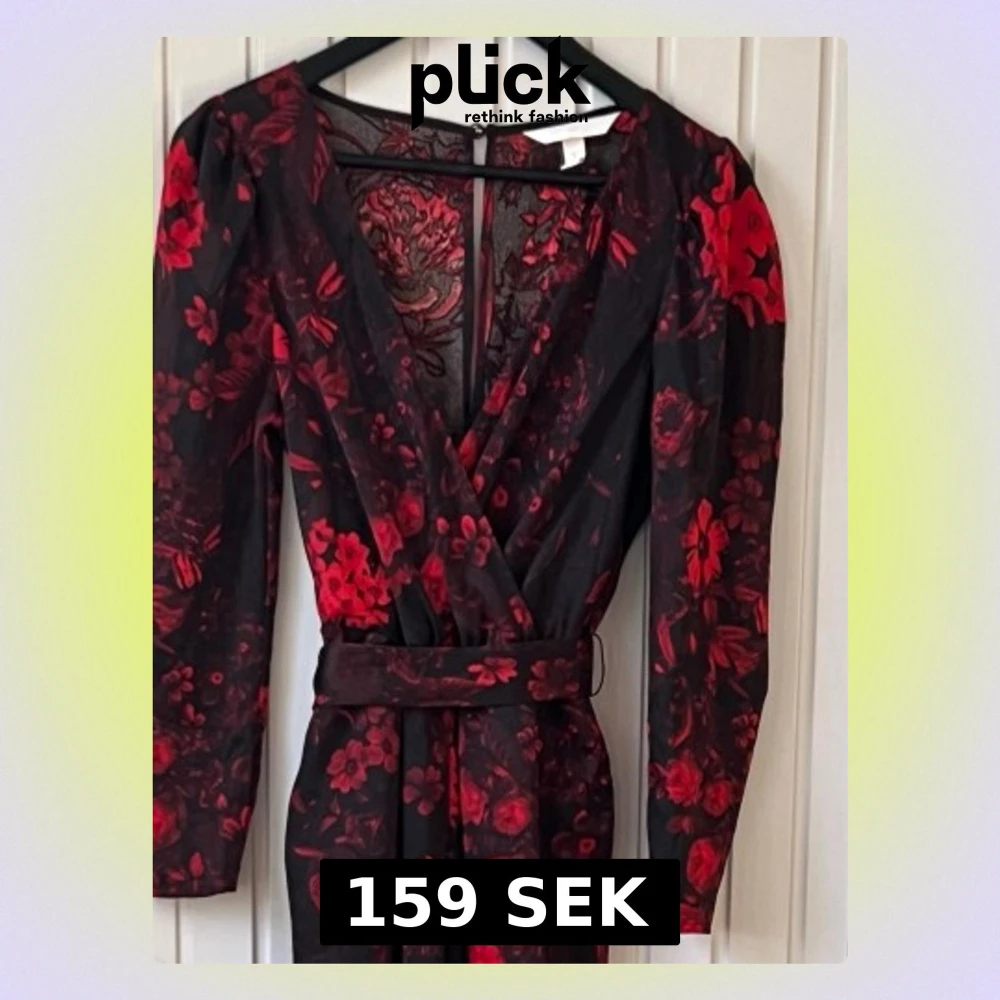 Jumpsuit med stort asymmetriskt mönster av djupröda blommor på svart/mörkt vinröd botten. Modell med resår i midja och djup omlott-skärning. Snyggt sprund baktill som knäpps med söt tygknapp i nacken. Superbekväm med fickor som ger en avslappnad och samtidigt uppklädd look. Materialet är mjukt syntet med snyggt fall. Raka byxben. Passa på att fixa julhelgens perfekta outfit - bästa vinterstassen. Obetydligt använd. Passar lika bra strl 36 som 38.