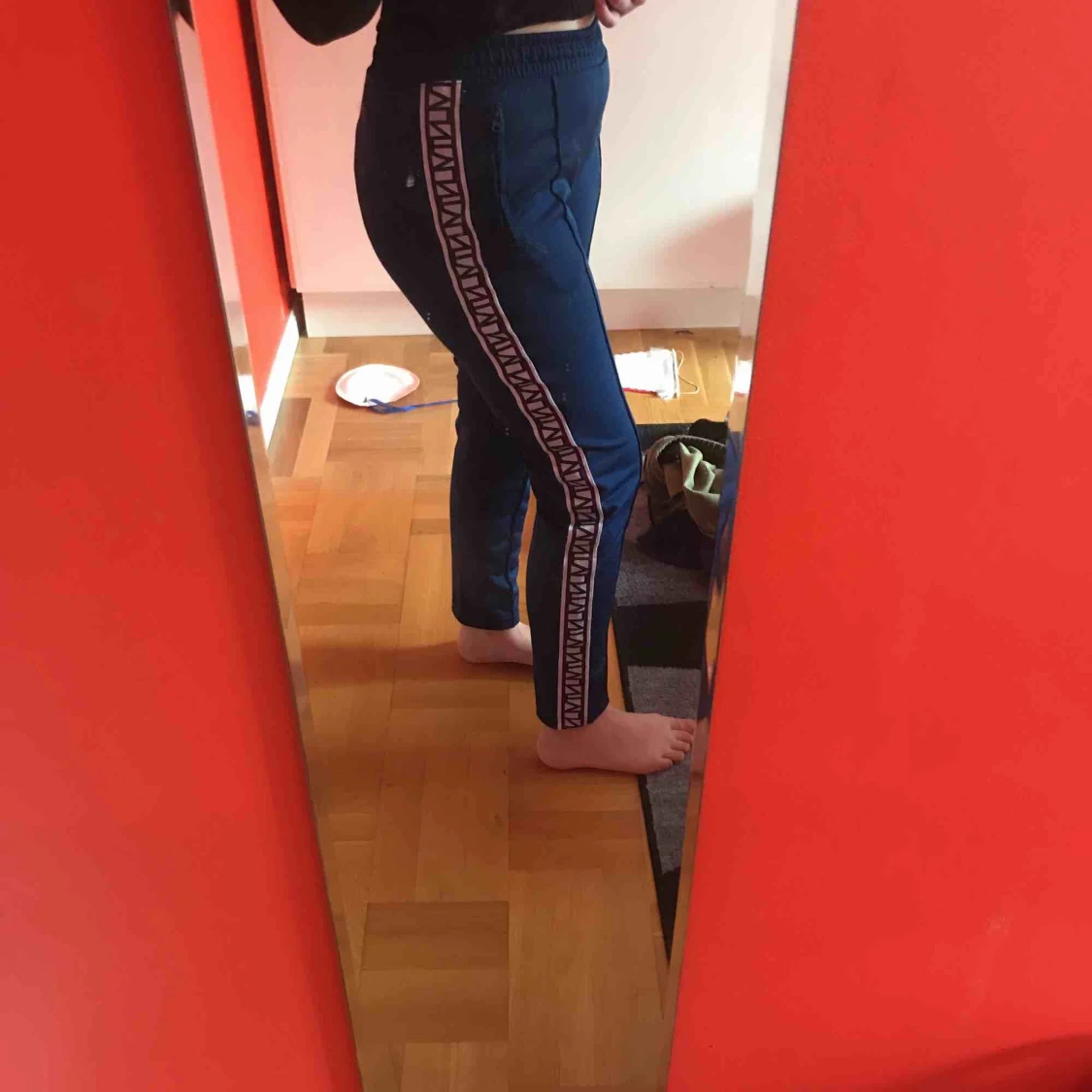 Ett par blåa byxor med detaljer på sidorna. Fickor med dragkedja finns även. Aldrig använda och säljer för dem inte används Köparen står för frakt