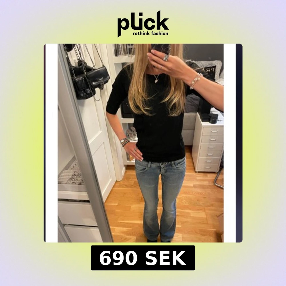 Snygga blå vintage bootcut jeans med väldigt låg midja, fickor fram och ett par lite lägre fickor bak för ännu snyggare. Storlek XXS. Skriv vid funderingar, frågor eller fler bilder! 💗