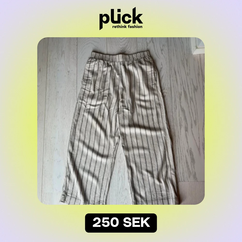 Jättesnygga linnebyxor perfekt nu till sommaren. Använd några gånger men är fortfarande i väldigt fint skick. Byxorna är i storlek 36 och är beigea med svarta ränder.