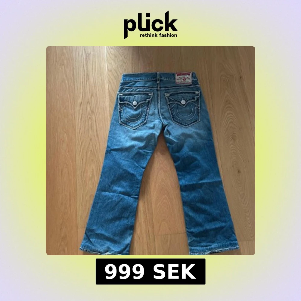 Säljer ett par blå jeans från True Religion med en cool slitning på. Dem är dekorerade med märkets ikoniska broderade fickor baktill. Perfekta för en avslappnad look. Fett snygga i helhet men mycket detalj - köpta från respektabel återförsäljare i irland (trueygarms) köpte de för 1300. Använts vardagligt finns syn på användning.