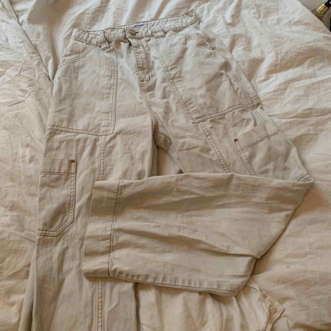 Ett par svinsnygga lite ”cargo” liknande byxor från Weekday, raka i modellen och går ner till anklarna på mig (är 170 cm) Ljusbeiga med jättemånga snygga detaljer och bruna sömmar! Använda ett få tal gånger och köpa för 500 kronor 🤗
