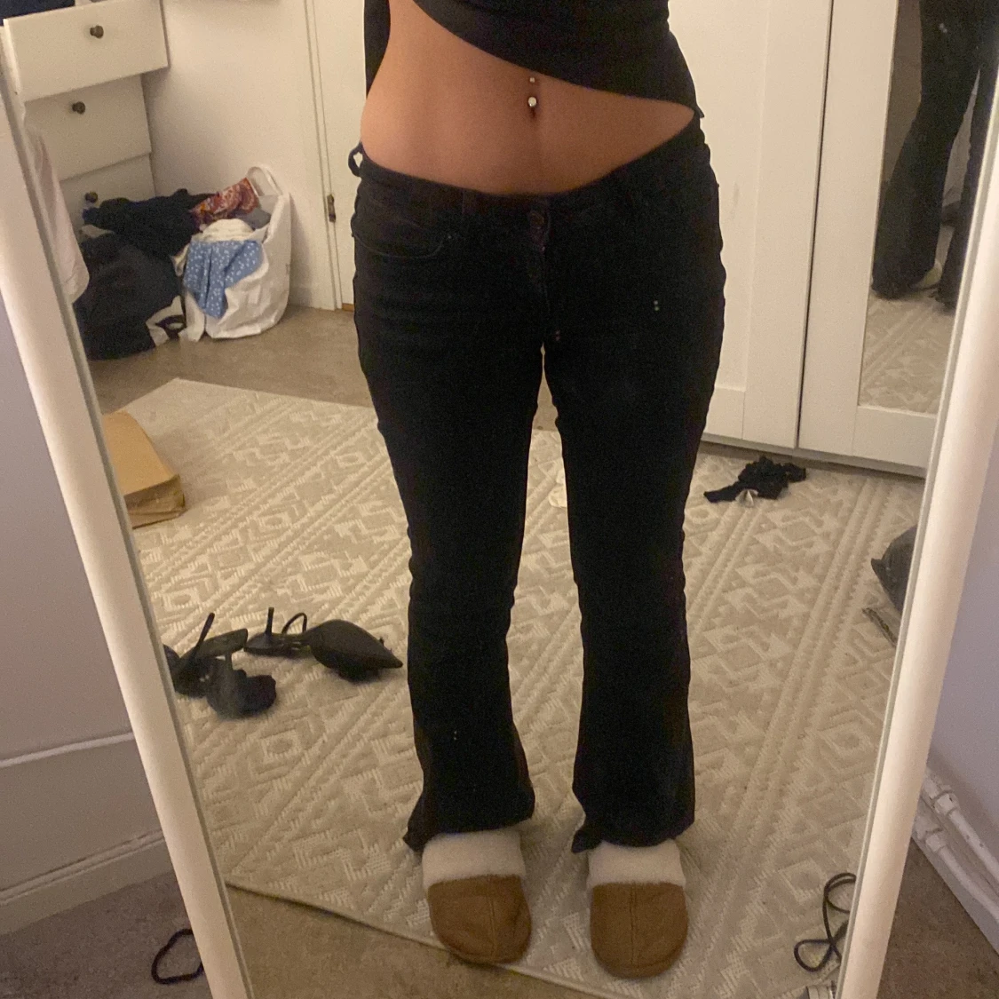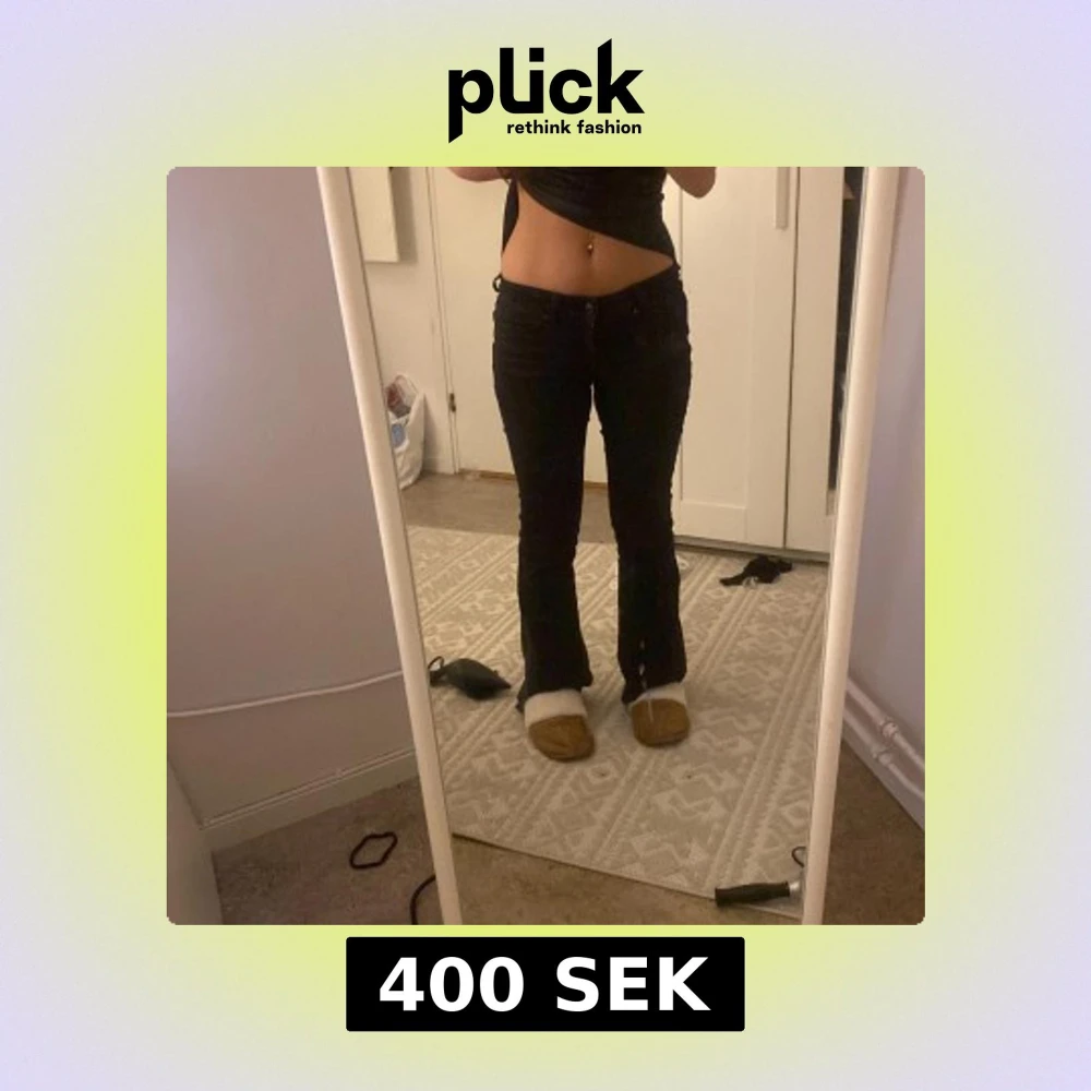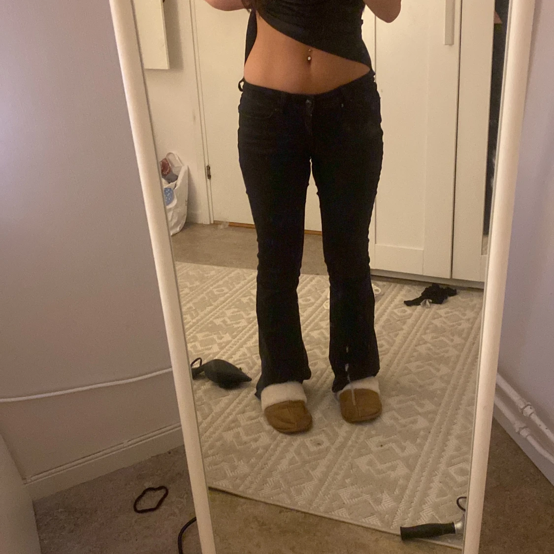 Säljer ett par svarta jeans med bootcut-modell och låg midja. Snygg passform som sitter tajt upptill och släpper ut vid benen. Klassisk femficksdesign och tillverkade i stretchig bomullsdenim. Perfekta till sneakers eller boots.