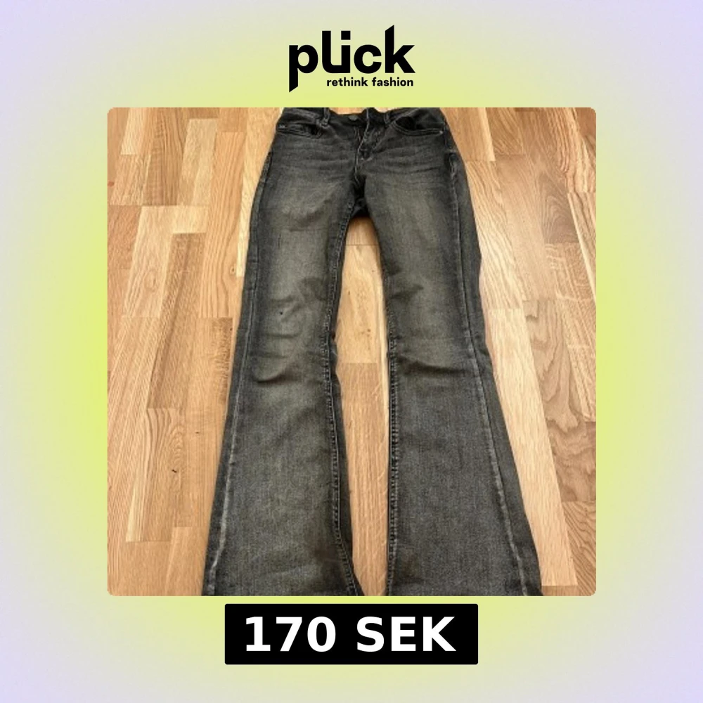 Snygga mörkgrå low waist bootcut jeans från Vero Moda. De har bara använts tre/två gånger men de har en liten fläck över ena knäet 💕💕