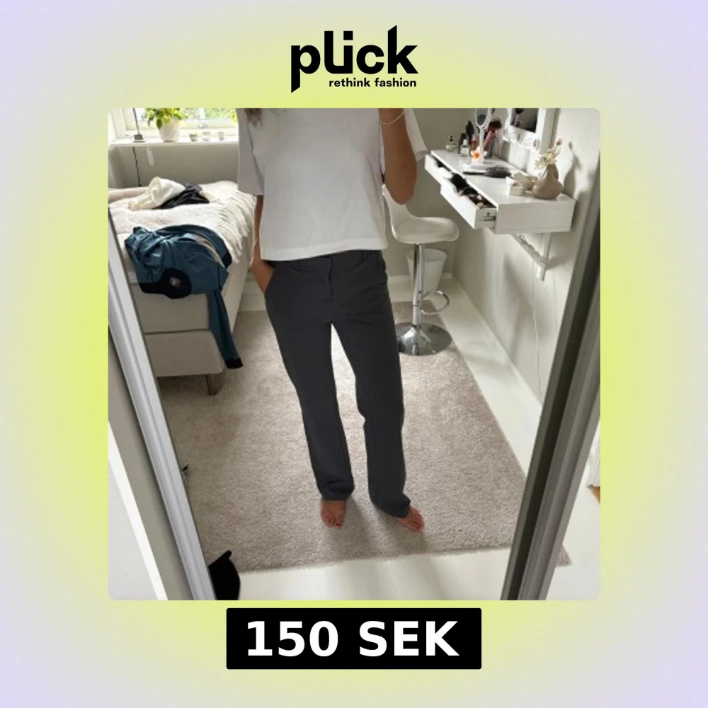 Säljer ett par mörkgrå kostymbyxor med raka ben och klassisk passform. Byxorna har hällor för bälte, diskreta fickor och stängs med dragkedja och knapp. Perfekta för en clean och stilren look.