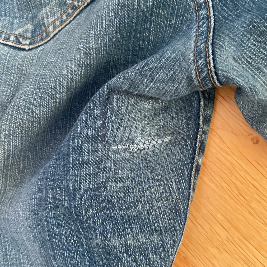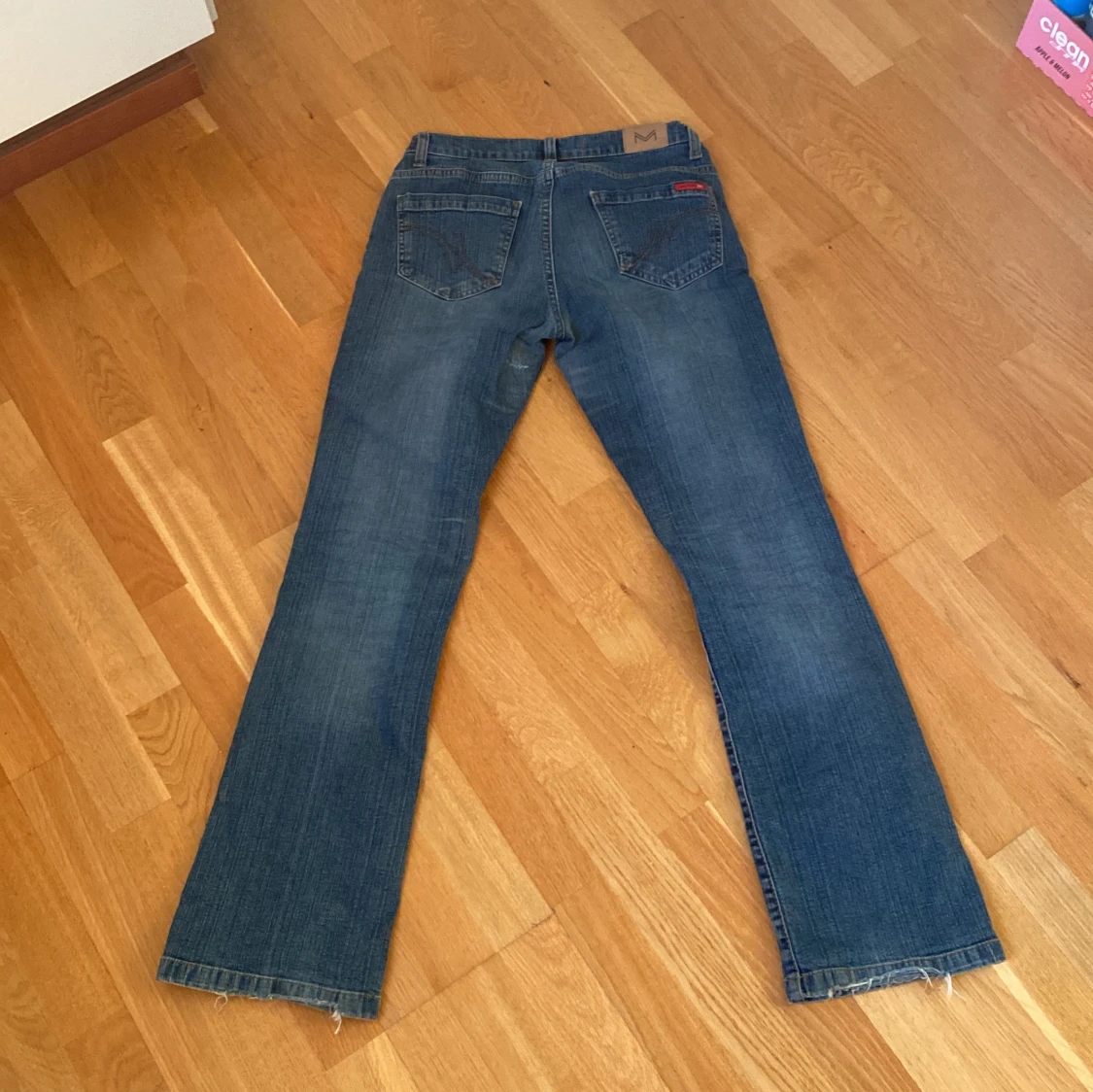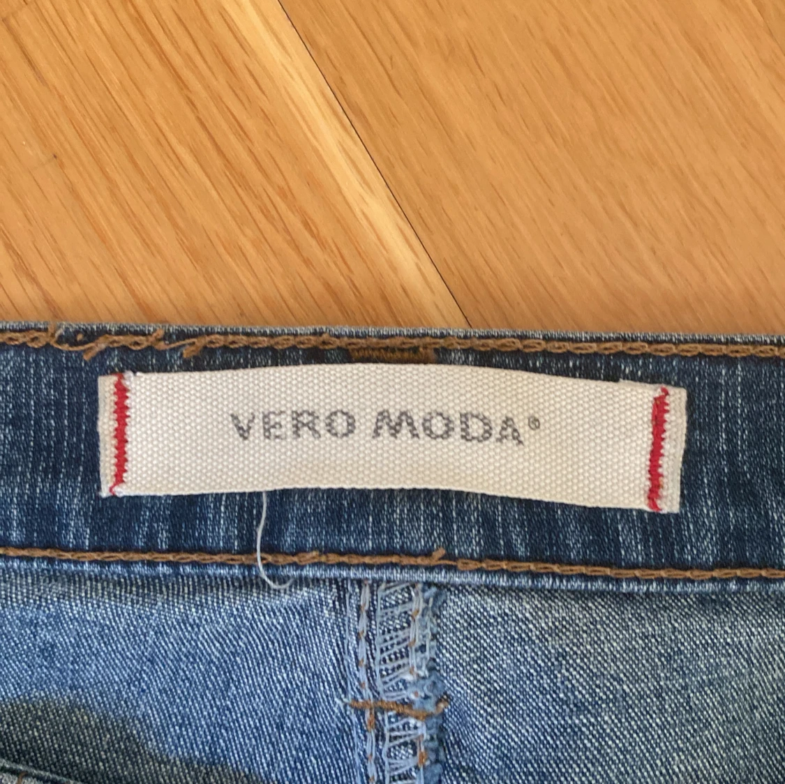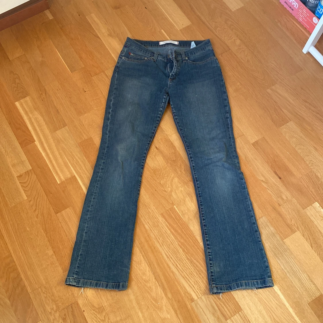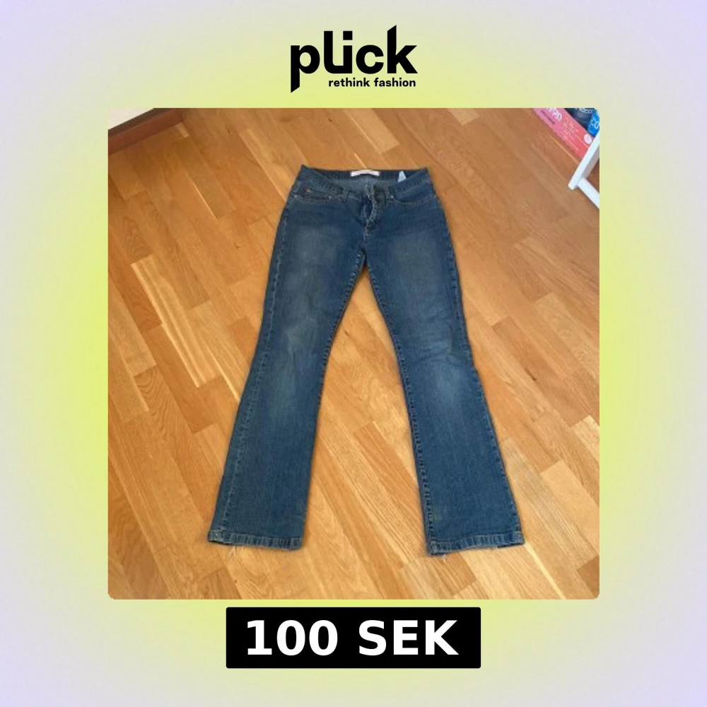 Säljer ett par klassiska blå jeans från Vero Moda. De har en bootcut-stil och är tillverkade i jeansmaterial. Jag köpte de på en loppis för ett år sen och det står inte vilken storlek men skulle säga att de sitter som 36. Andvänt skick och jag har sytt de på innerlåret, inget man ser men det finns där iaf bild på det på sista sliden.