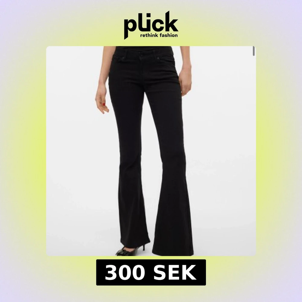 Säljer ett par svarta bootcut jeans med klassisk femficksdesign och låg midja. Strl M och längd 34, dock är de uppsydda för att passa mig som är 170!