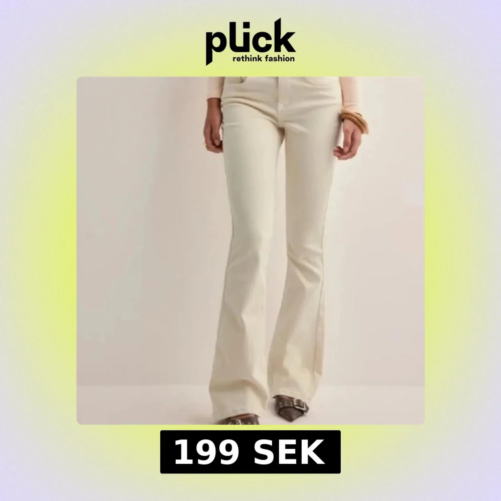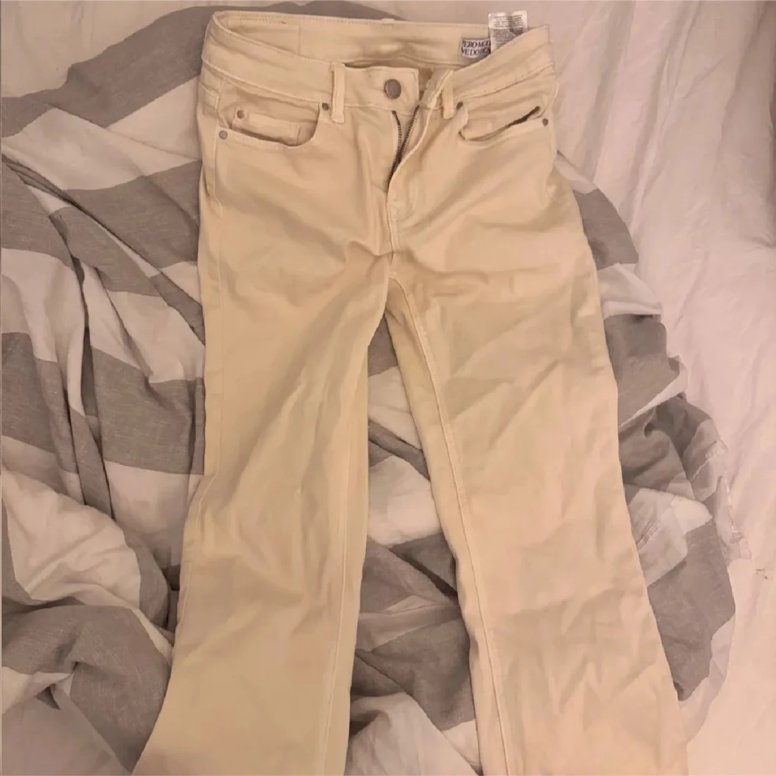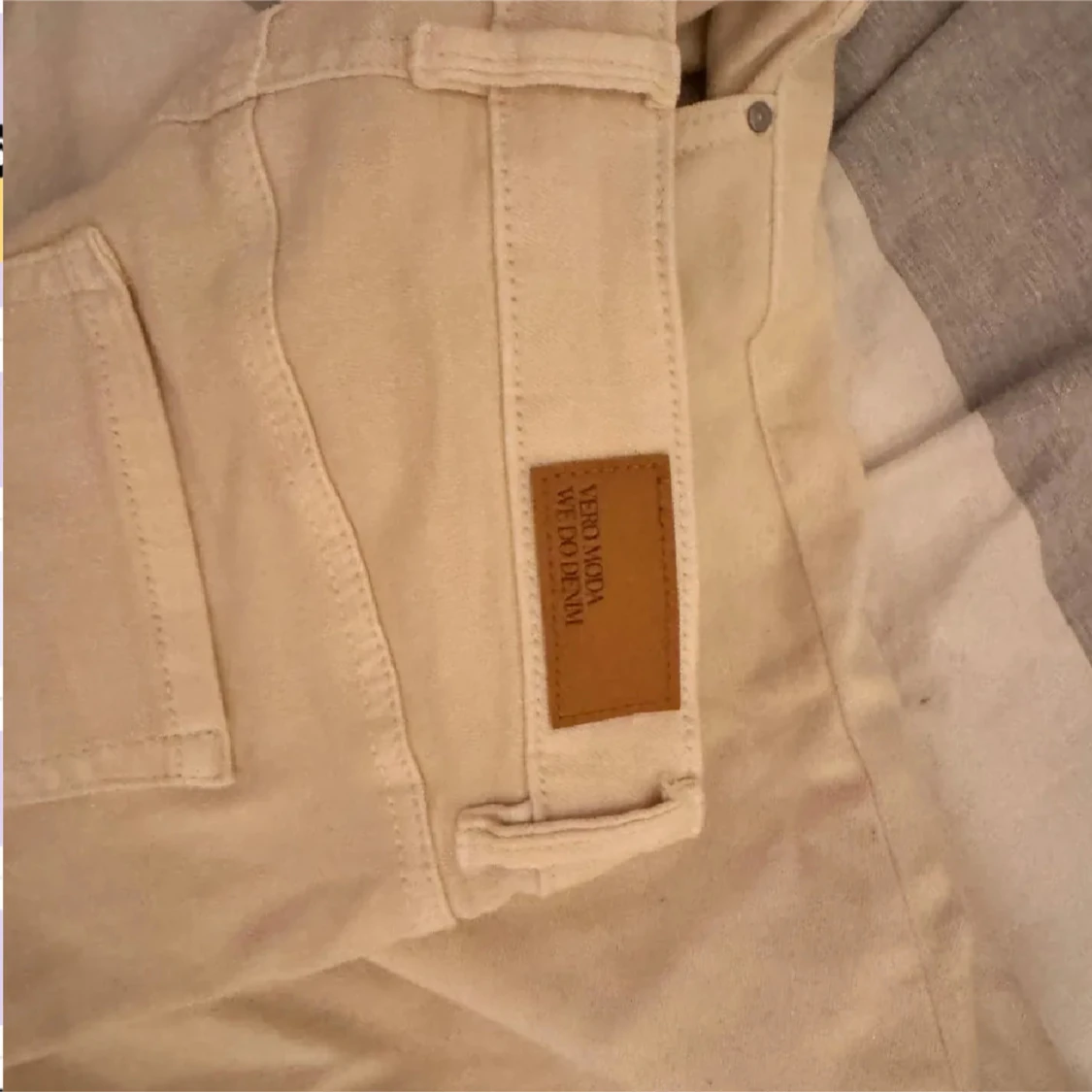 Snygga ljusbeige bootcut jeans från Vero Moda med klassisk femficksdesign och dragkedja. Byxorna har hög midja och är tillverkade i mjukt bomullsmaterial med lite stretch för skön passform. Perfekt för dig som gillar retrovibbar och stilrena färger.