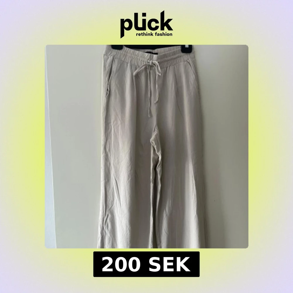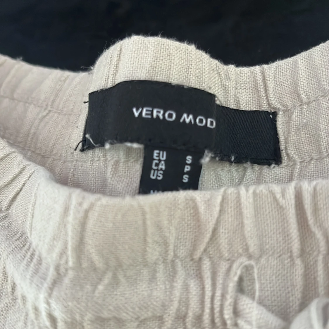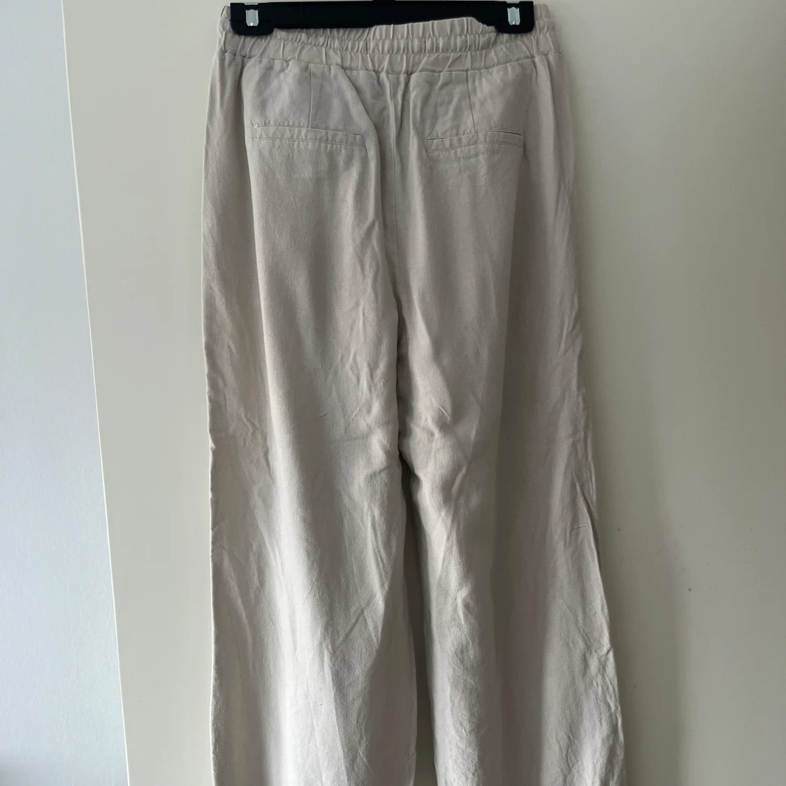 Snygga och luftiga beiga linnebyxor från Vero Moda. Byxorna har resår och snörning i midjan, raka vida ben och fickor både fram och bak. Fickorna därbak är stängda och går ej att öppna. Dessa linnebyxor perfekta för en chill och avslappnad stil under varmare dagar. Dessa linnebyxor är knappt andvända och i ett mycket bra skick. Kontakta för fler bilder eller frågor.