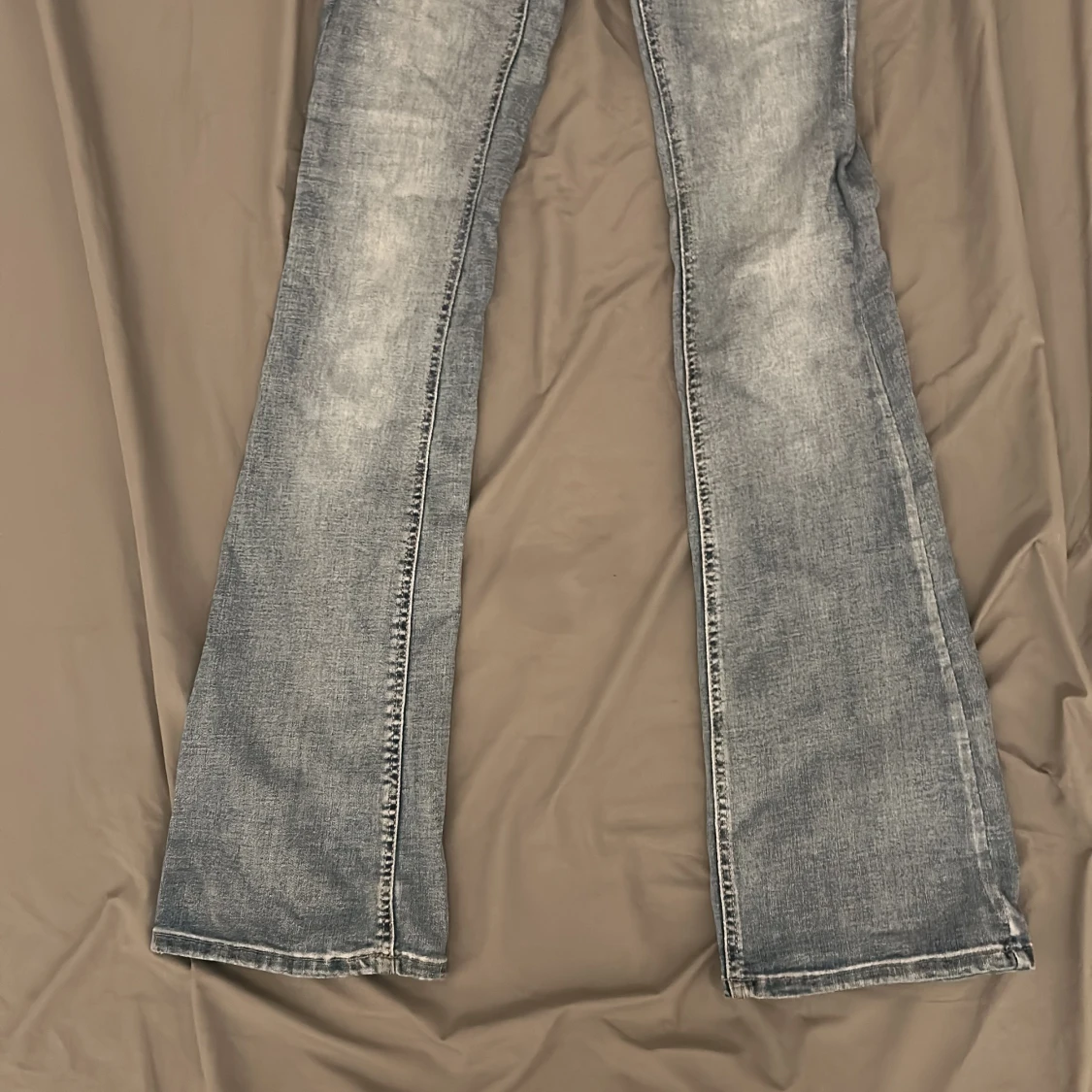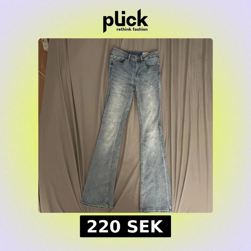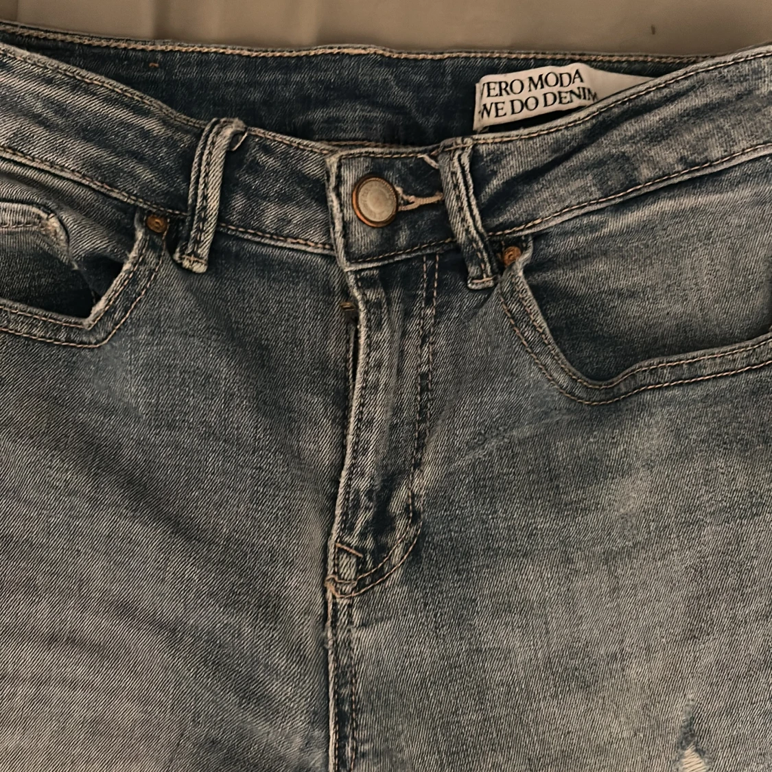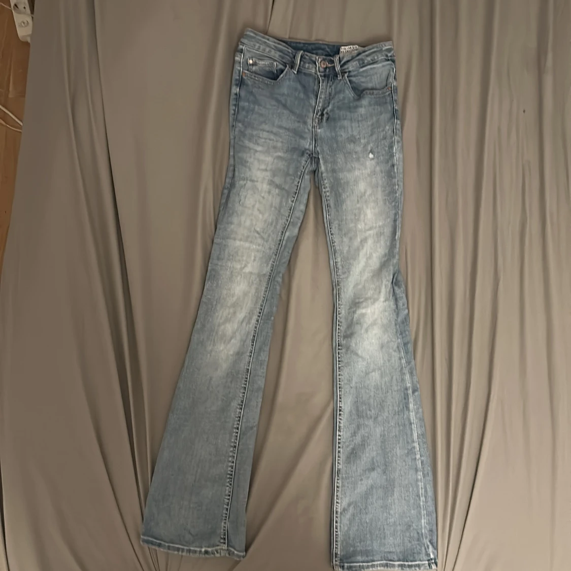 Snygga ljusblå bootcut jeans från Vero Moda med klassisk femficksdesign och slitna detaljer. Jeansen har normal passform och är tillverkade i mjukt denimtyg med dragkedja och knapp framtill. Perfekt för dig som gillar retrovibbar och avslappnad stil. I storlek S. Jeansen kostade ungefär 600kr.