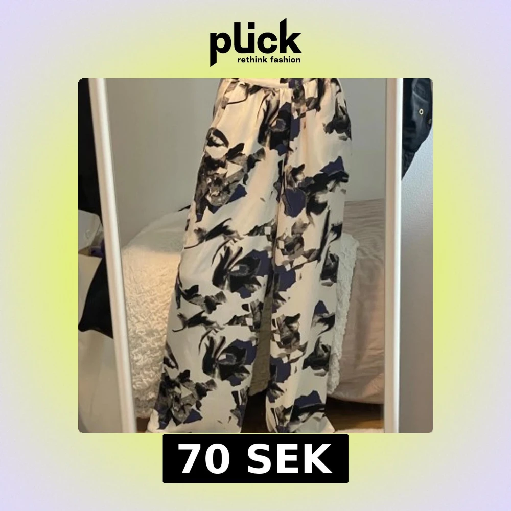 Säljer ett par riktigt snygga vida byxor med abstrakt svart och mörkblått mönster på vit botten. Byxorna har hög midja och är tillverkade i ett mjukt, flowy material som känns luftigt och skönt. Perfekta för dig som gillar statement-plagg och vill sticka ut.