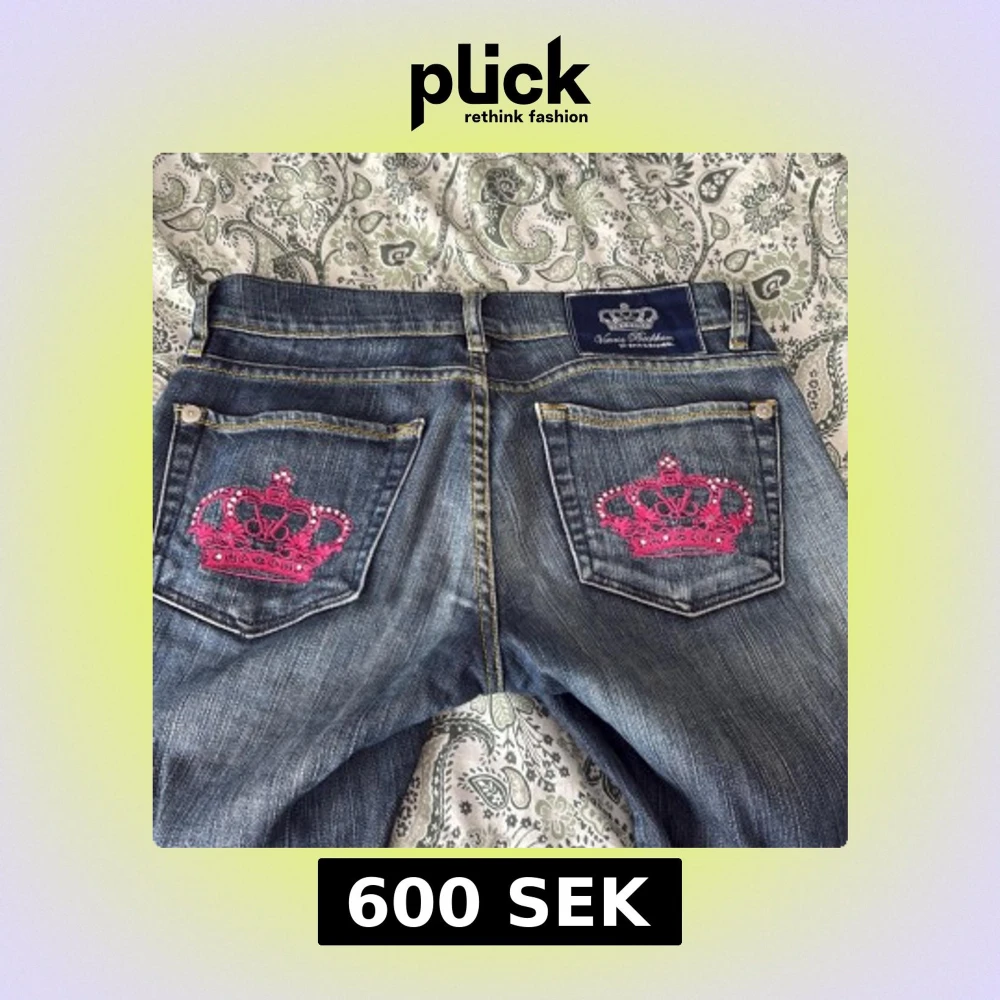 Mörkblå jeansbyxor från Victoria Beckham med raka ben och snygga slitningar. Bakfickorna har broderade rosa kronor med paljettdetaljer. Klassisk femficksmodell med knappar och dragkedja framtill.
