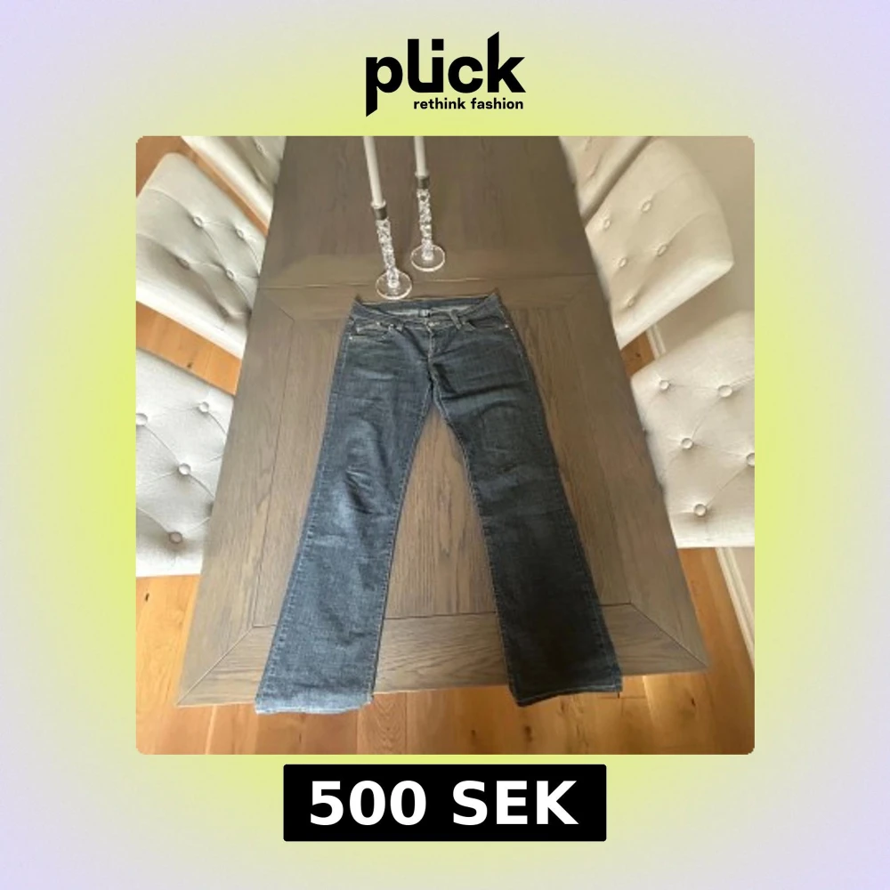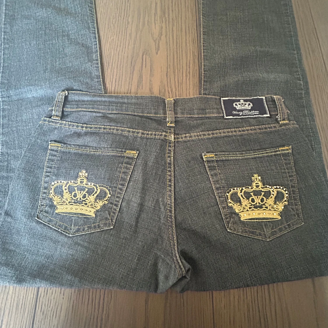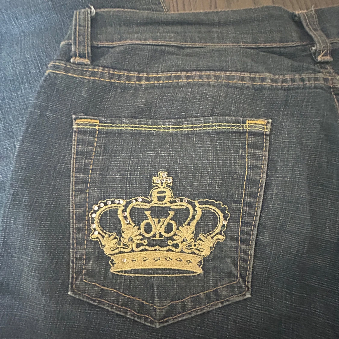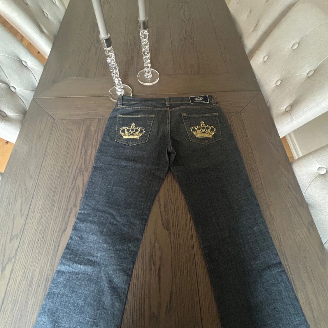 Snygga mörkblå jeans från Victoria Beckham med raka/utsvängda ben. Jeansen har guld kronor på bakfickorna som tyvärr har tappat ett par stenar men är fortfarande jätte snygga! Bra skick annars.