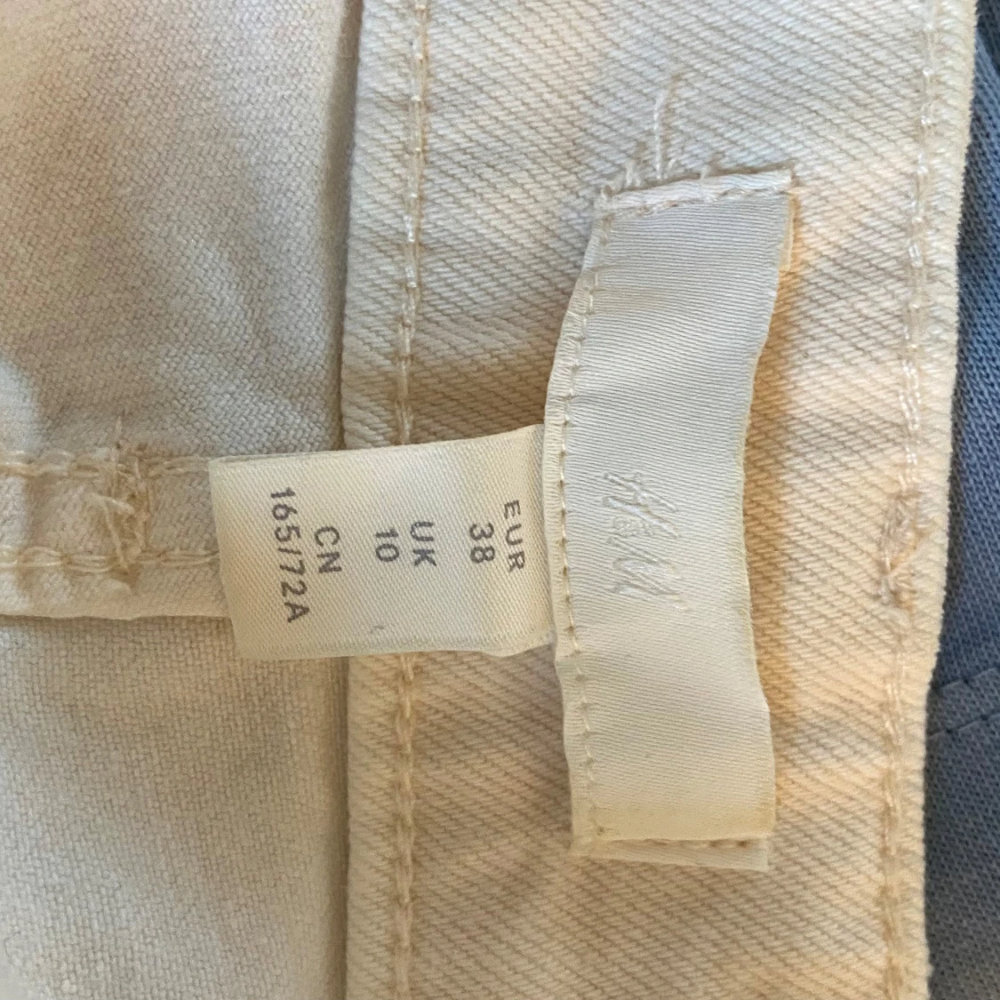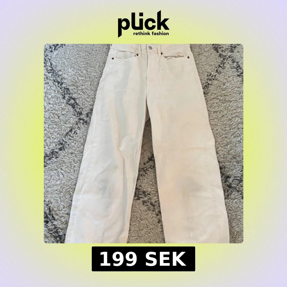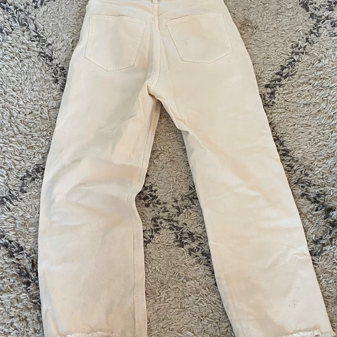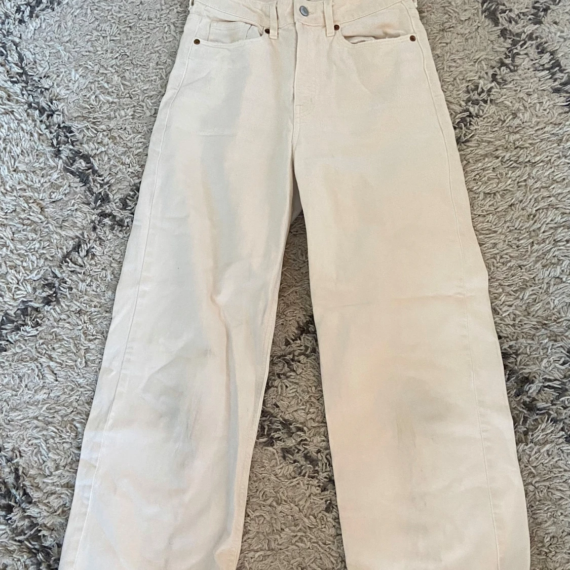Snygga beige jeans från H&M i storlek 38. Modellen är rak och lite vidare i benen med klassiska fem fickor och hög midja. Jeansen är tillverkade i bomull och har en ljus, fräsch färg som passar till allt.
