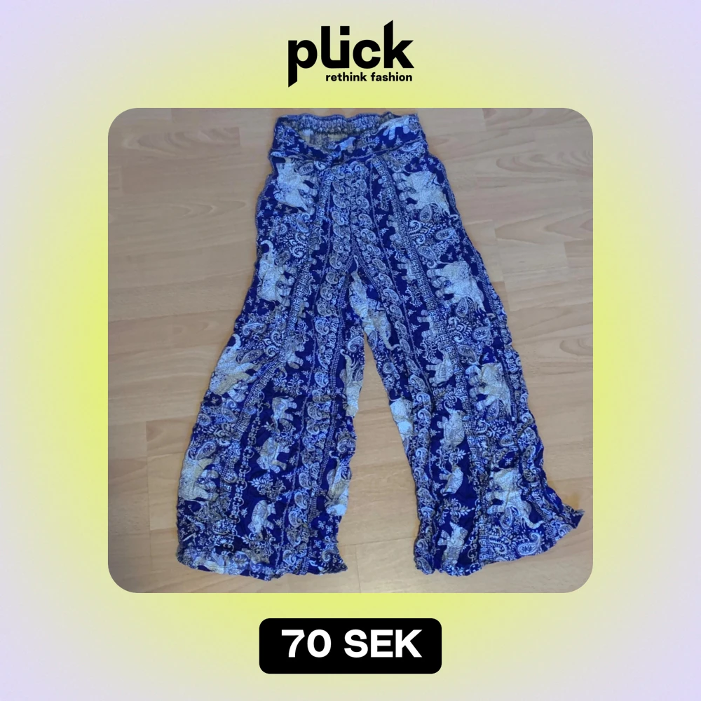 Säljer ett par supercoola vida byxor med ett unikt mönster i blått och vitt. De är perfekta för sommaren med sitt lätta och luftiga material. Byxorna har en hög midja och ett elastiskt band för extra komfort. Perfekta för en avslappnad dag eller en sommarfest! 🌞