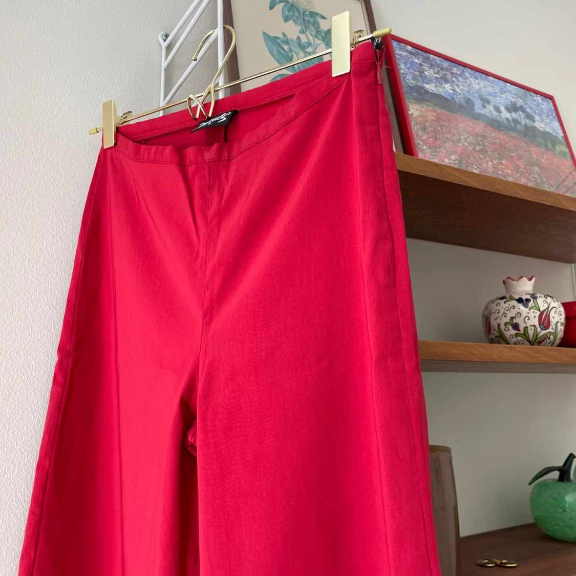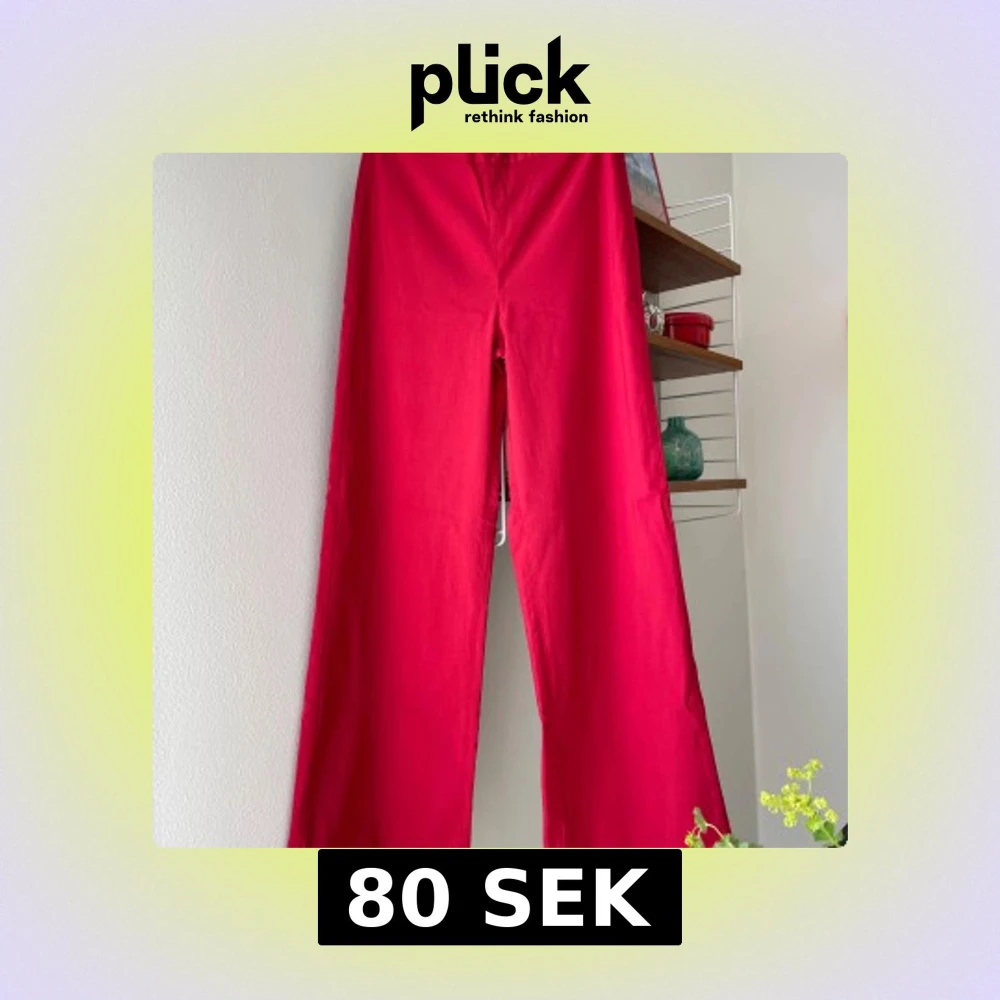 Röda, vida byxor. Strl S. Midjemått: 66 cm, innerbenslängd: 75 cm. Liten fläck på ena skinkan, i övrigt fint skick!