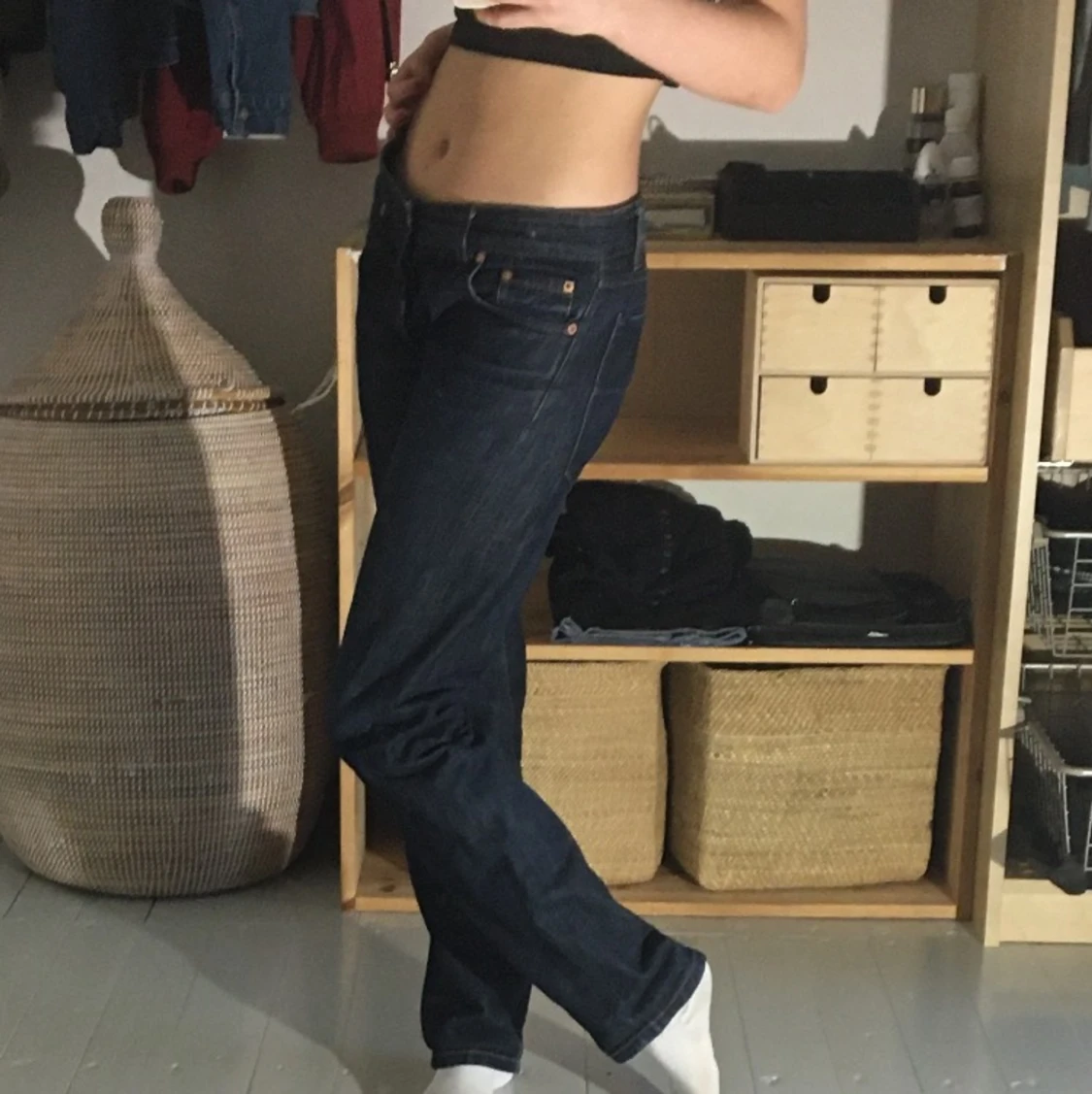 Säljer dessa mellan/låg midjade jeansen från Filippa K. Passar ungefär W25. Jag är 168cm och de går ner till hälarna på mig.