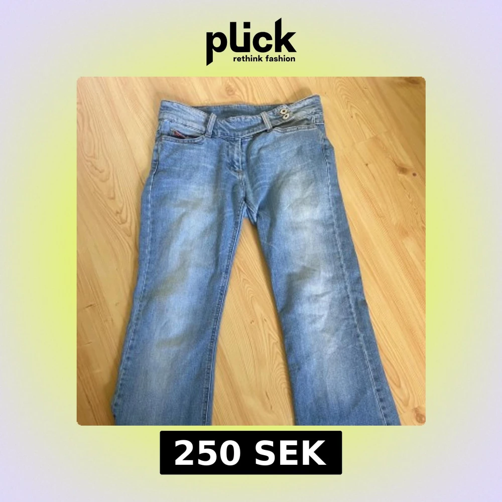 Säljer ett par ljusblå jeans från Vila med bootcut-modell. Jeansen har två knappar i midjan, klassiska fickor och snyggt slitna detaljer. Är i storlek M men är små i modellen