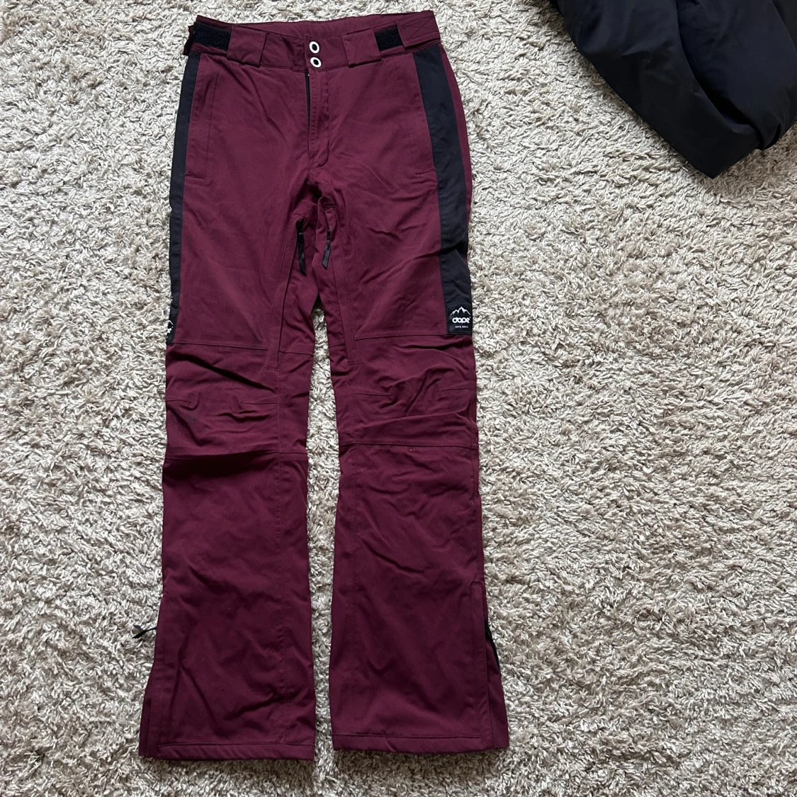 Snygga vinröda skidbyxor från Dope med svarta detaljer längs sidorna. Bred bälteshälla, gylf och knappar. Fickor både fram och bak. Byxorna har en snygg passform som är lite tajtare över låten och bredare ner mot vaderna, samt en dragkedja för att justera och utsvängda man vill ha dem.💕 nypris 1999
