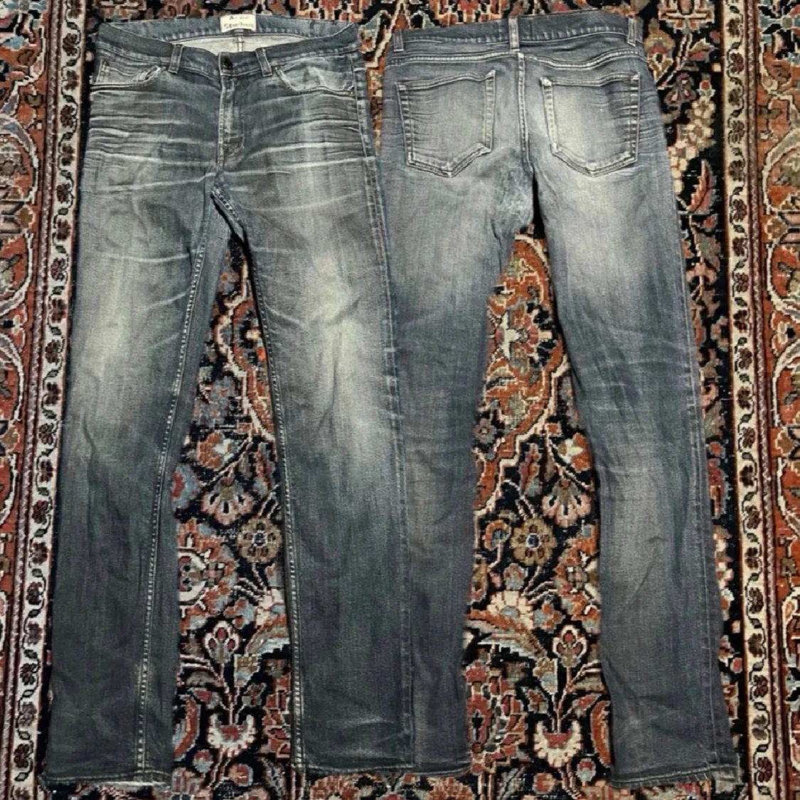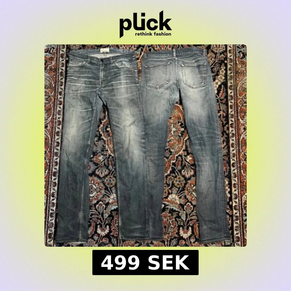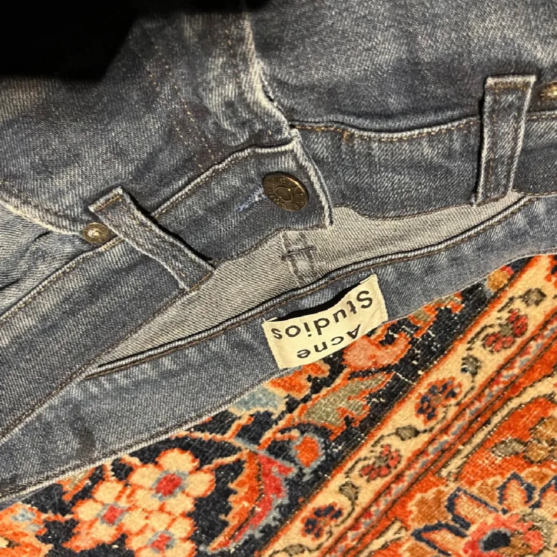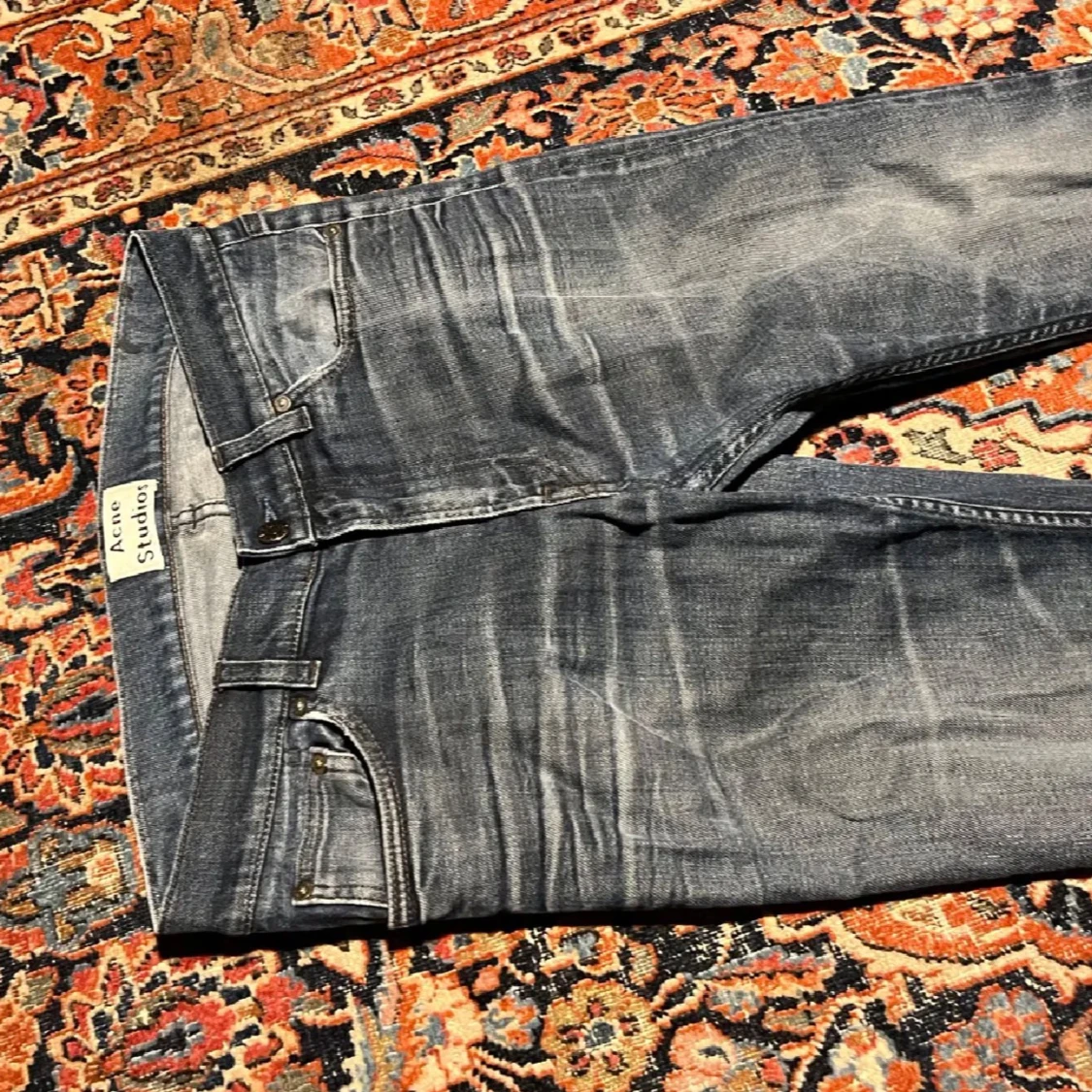 Riktigt feta blå acne jeans med en cool tvätt! Slim passform. Mått: Midja:39cm Längd:100cm Benöppning:16cn