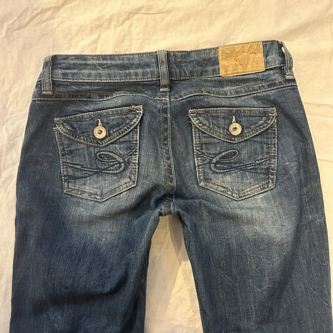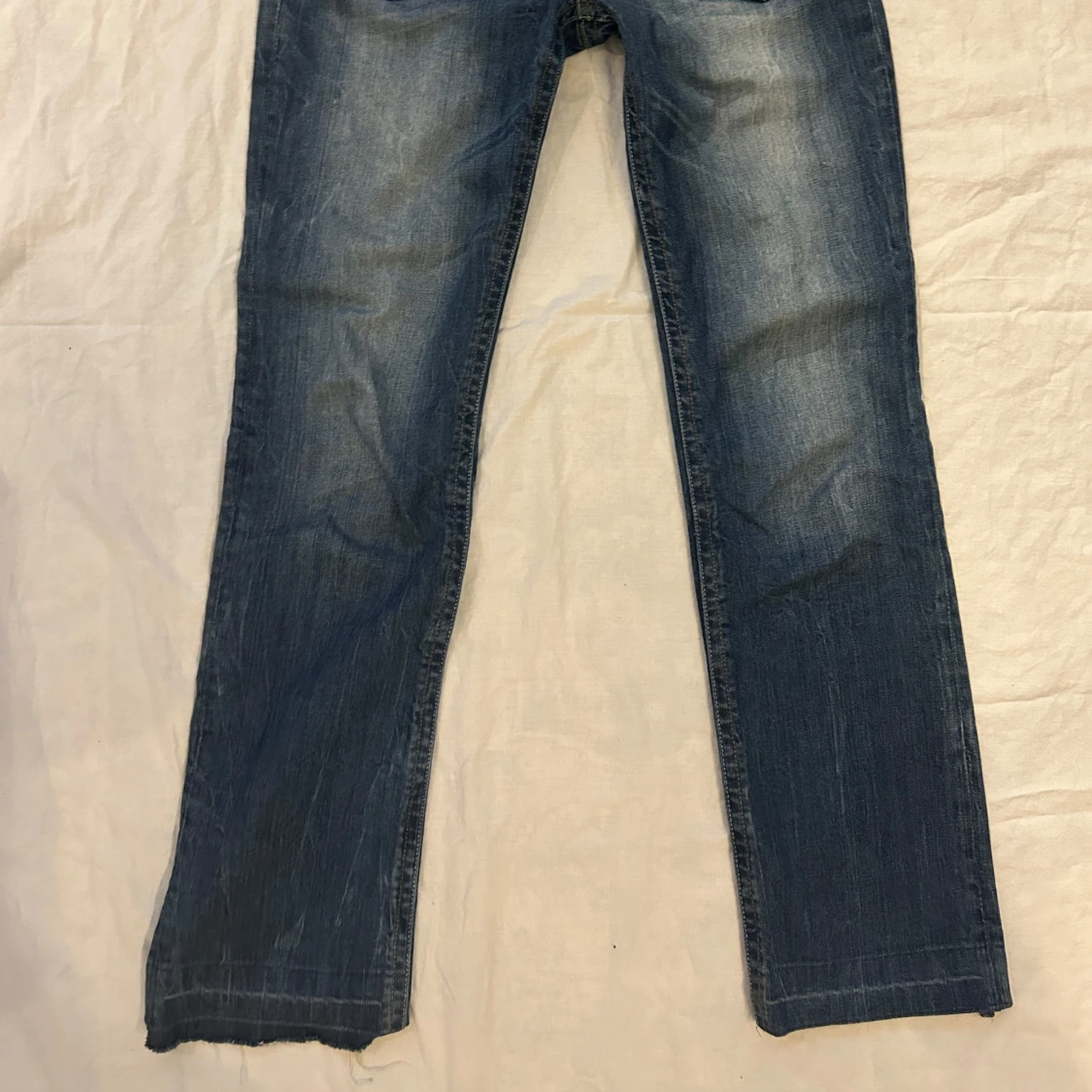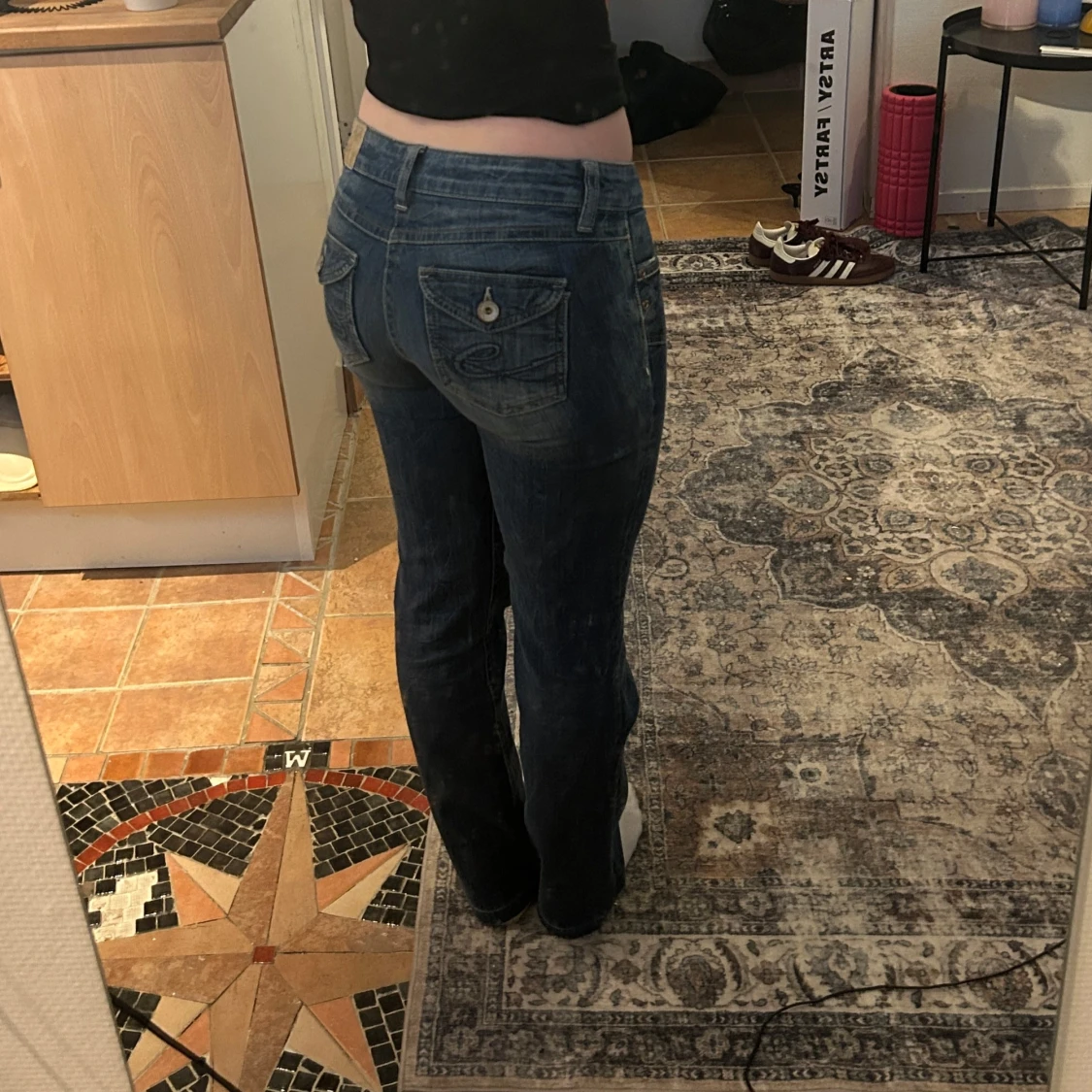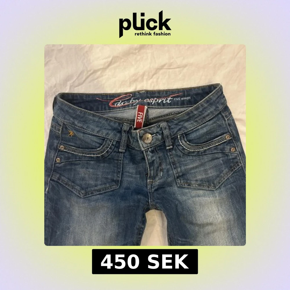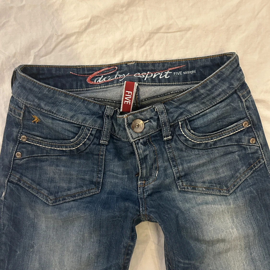 Vintage jeans från Esprit med låg midja och flared/straight leg (se bild). De är i mycket bra skick och är i stl Small. midja:35, grenmått: 19cm, innerbenslängd: 76cm, benöppning: 19cm