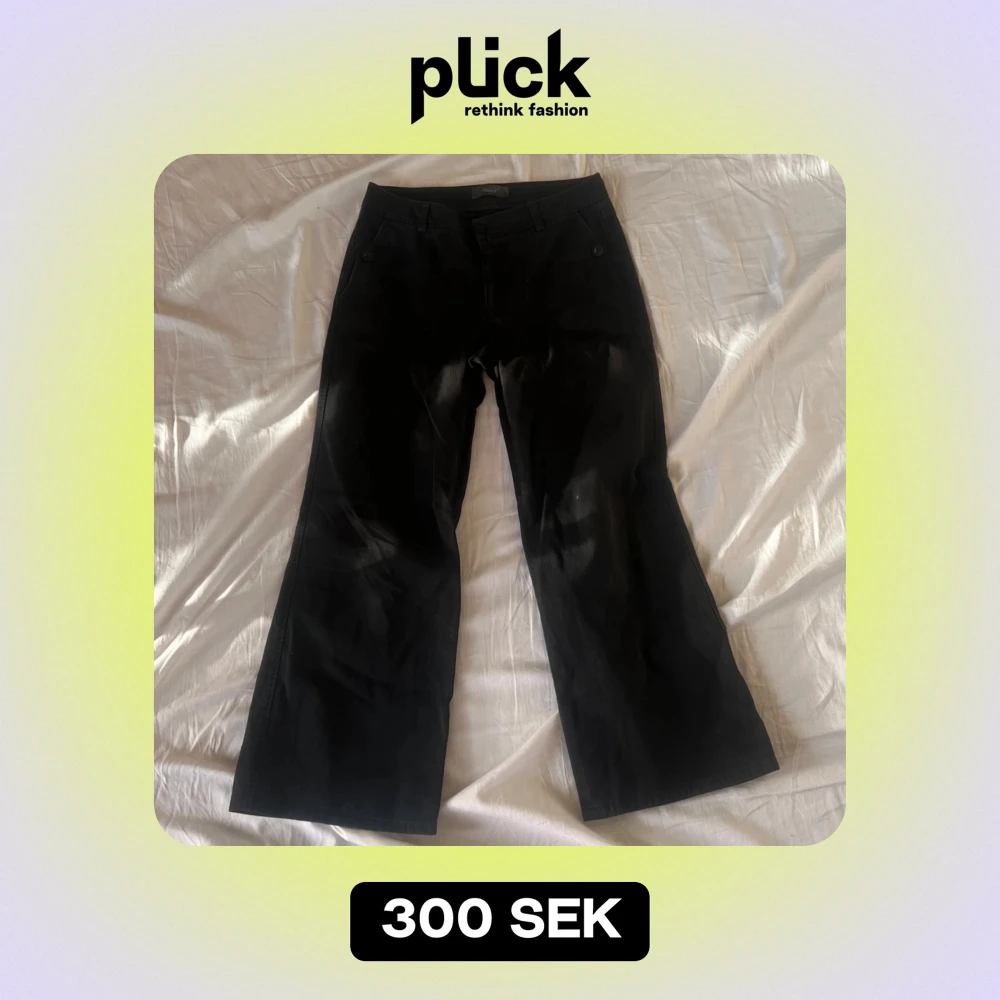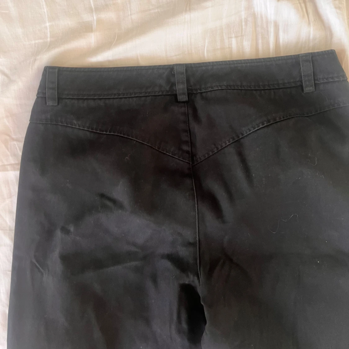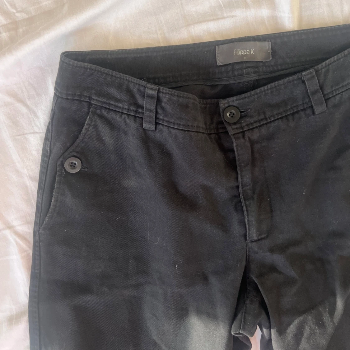 Snygga svarta byxor från Filippa K i mycket bra skick. De har en klassisk design med knappar och bälteshällor. Passformen är normal och materialet känns bekvämt och hållbart. Finns ett litet brännmärke på ena byxbenet som man ser på sista bilden