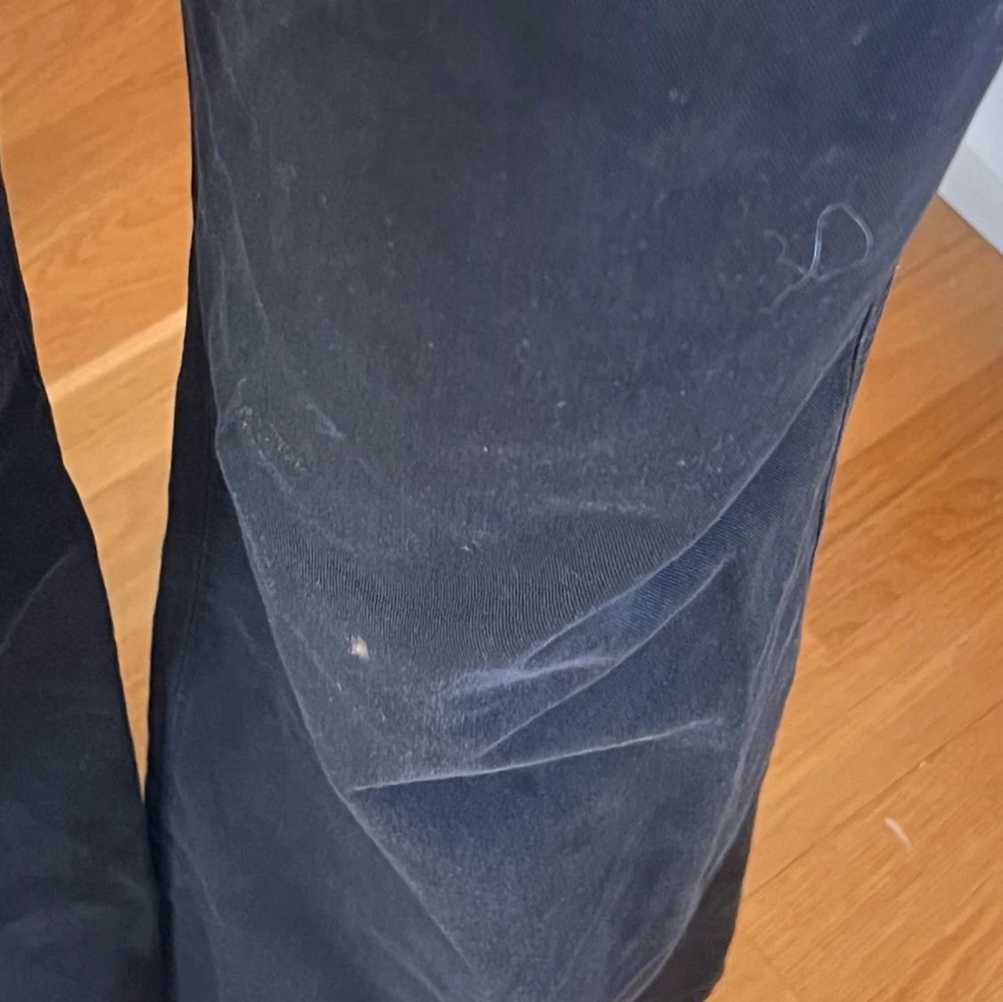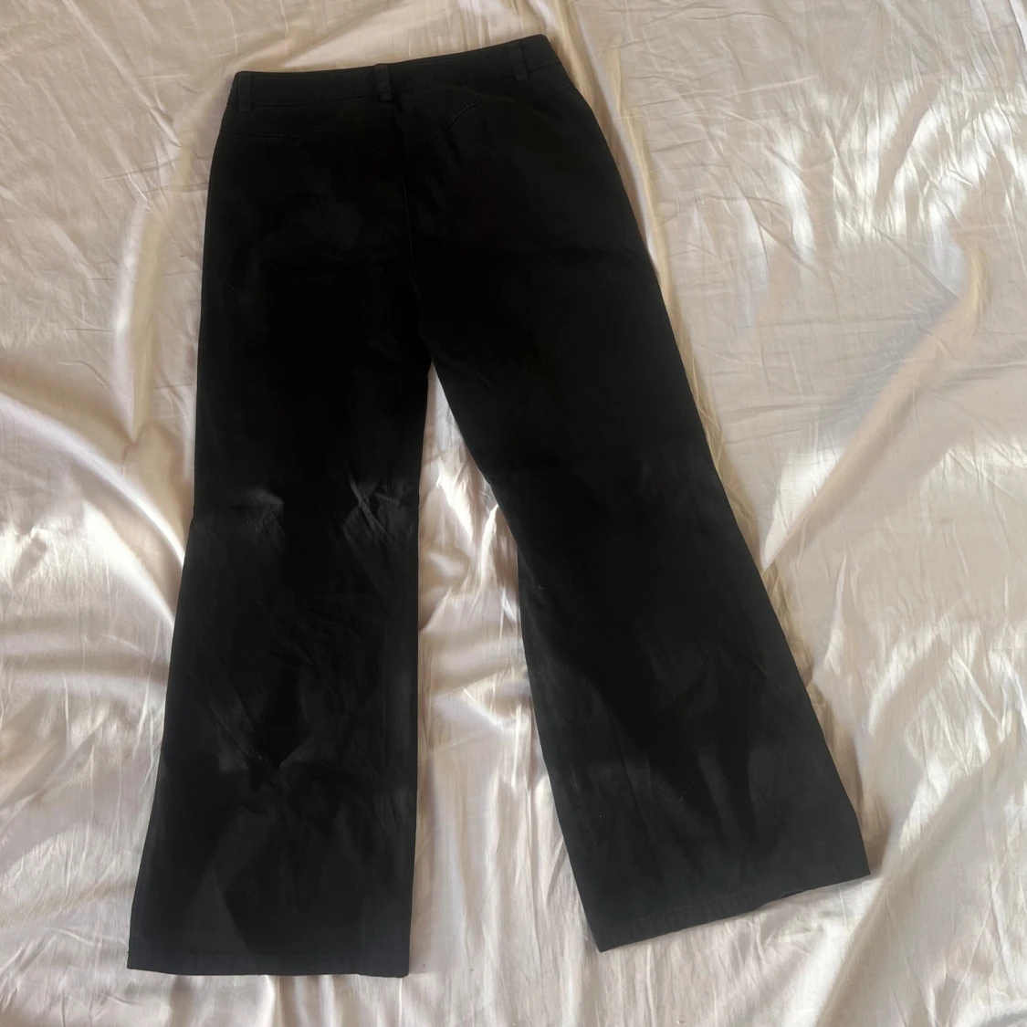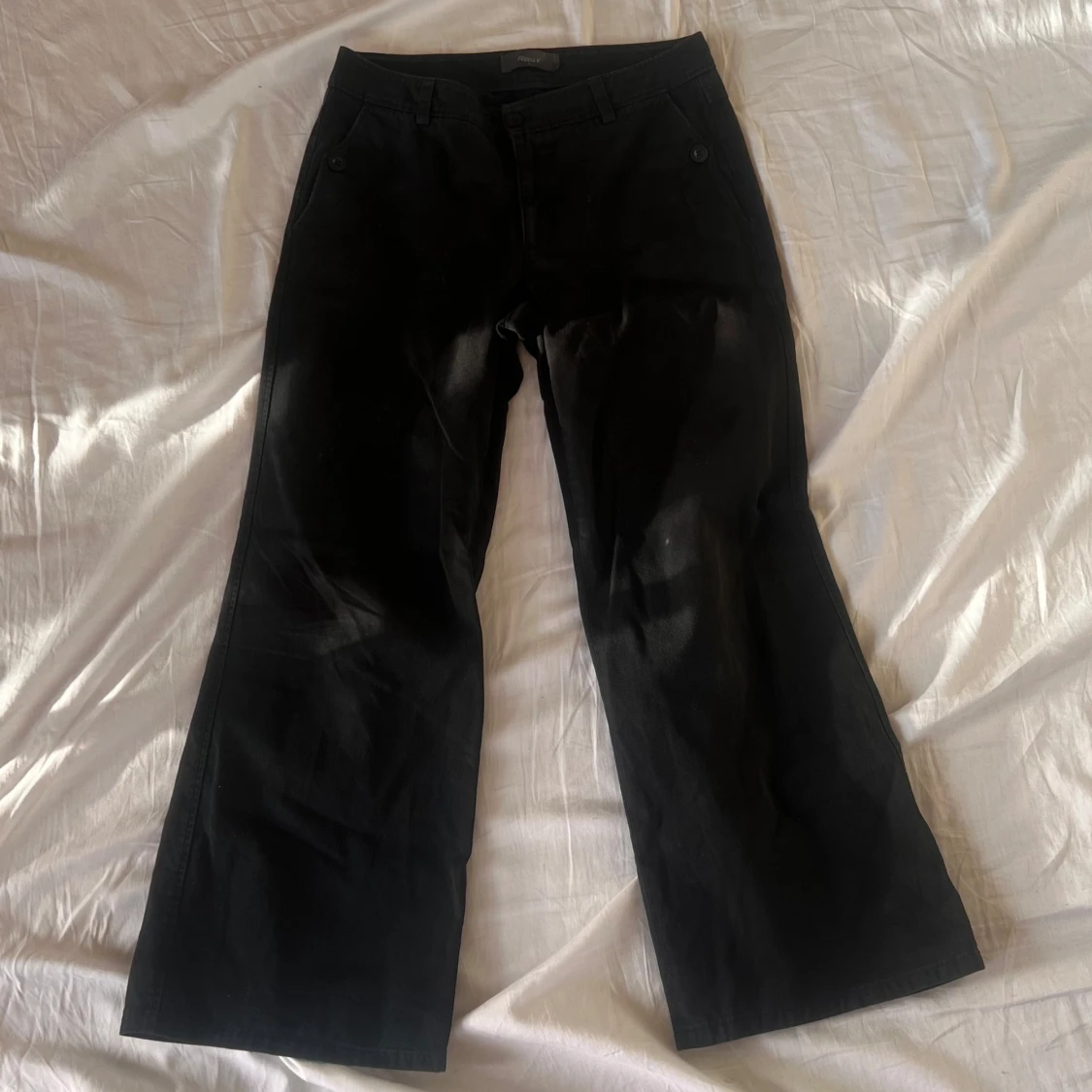 Snygga svarta byxor från Filippa K i mycket bra skick. De har en klassisk design med knappar och bälteshällor. Passformen är normal och materialet känns bekvämt och hållbart. Finns ett litet brännmärke på ena byxbenet som man ser på sista bilden