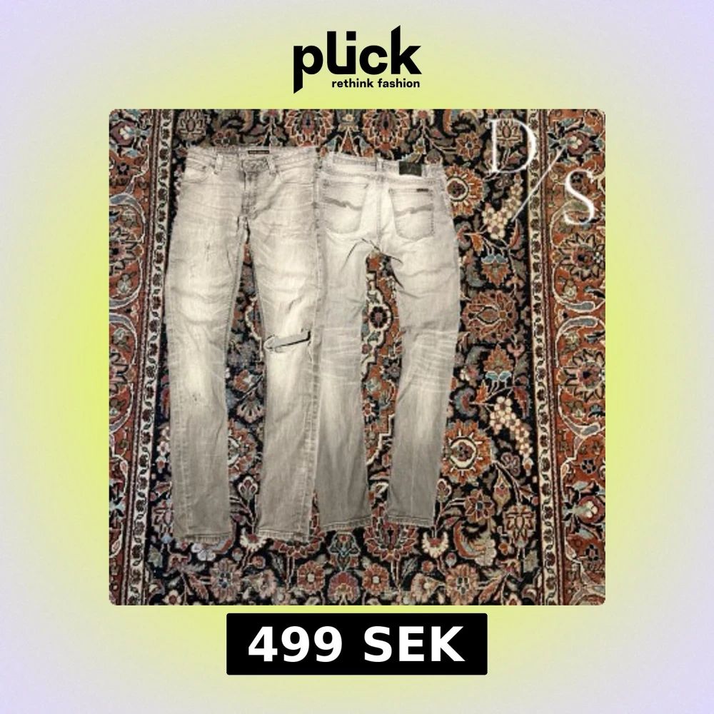 Riktigt snygga vintage grå nudie jeans! Några hål men vill man fixa de är de gratis att laga på nudie! Har ingen aning vilken modell de är för de har under tid fadeats bort! Fitpic kan jag ej ta för de passar inte mig. Mått: Midja:36,5cm Längd:101cm Benöppning:15cm