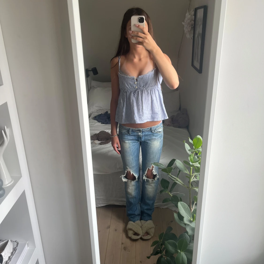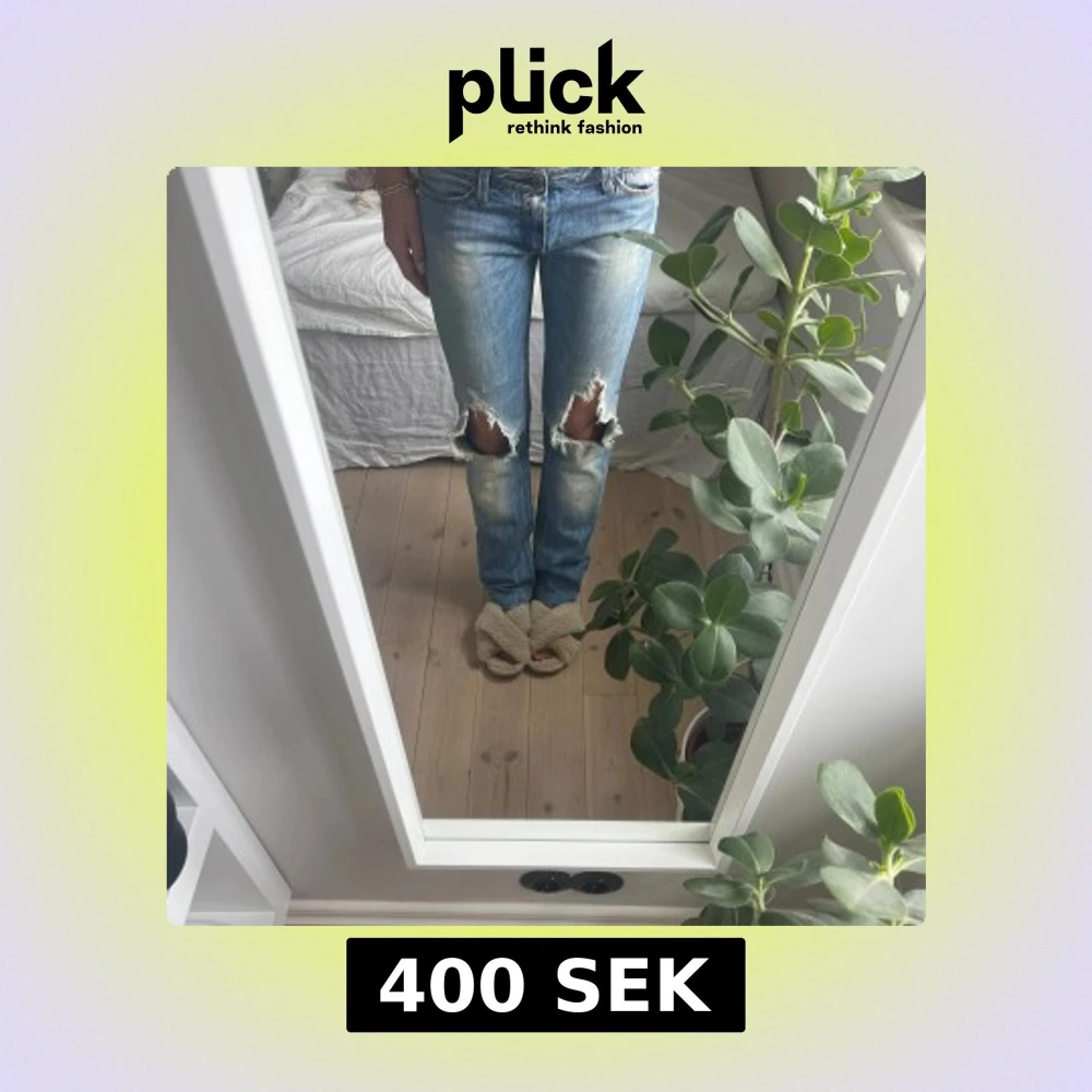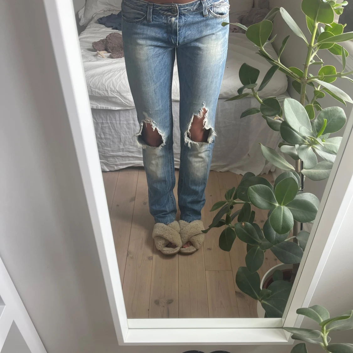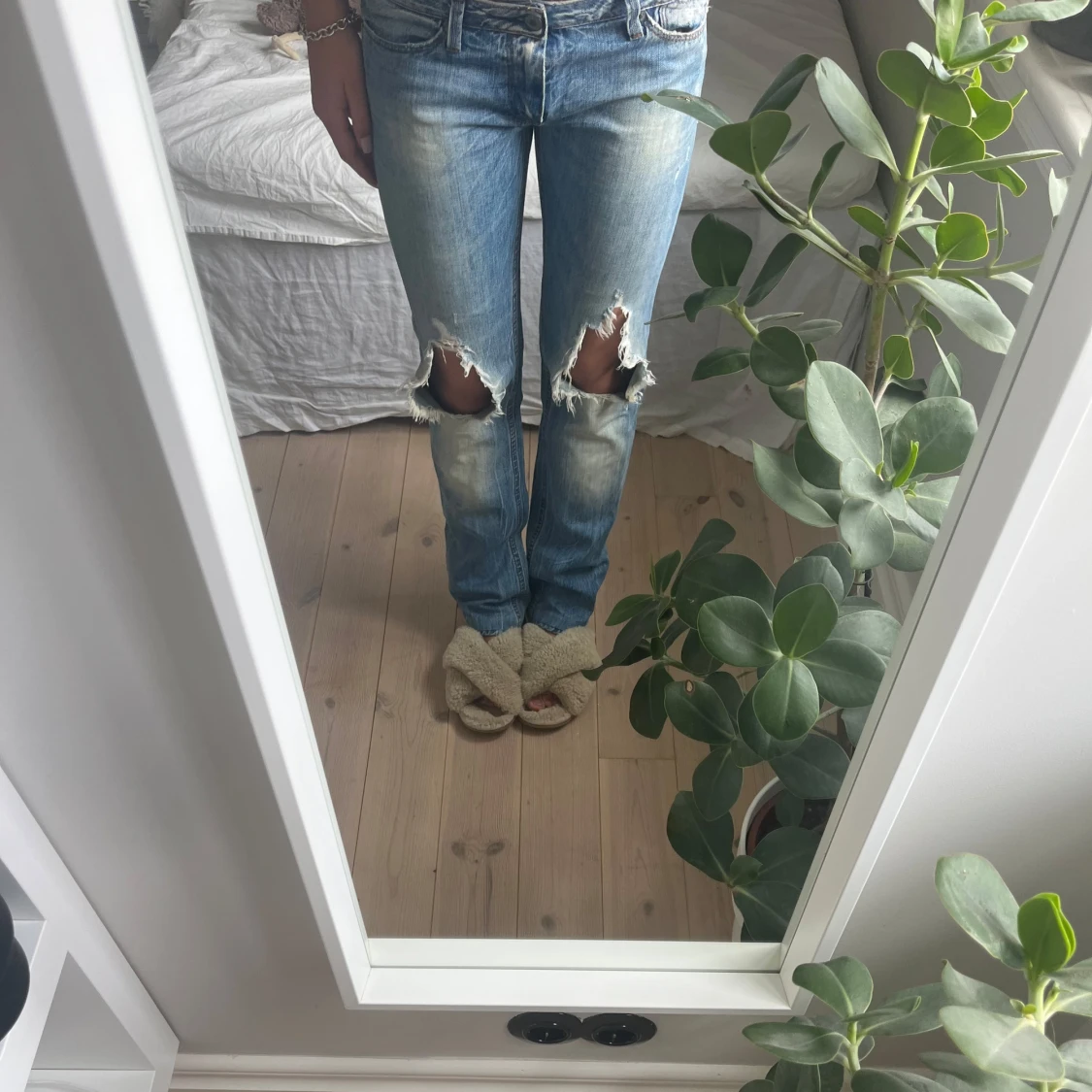 Svin snygga låg midjade utsvängda jeans med hål. Köpt på plick. Finns inga lappar men jag är 169 för referens och skulle säga att de passar xs/s. Kan kolla måtten om man är intresserad!