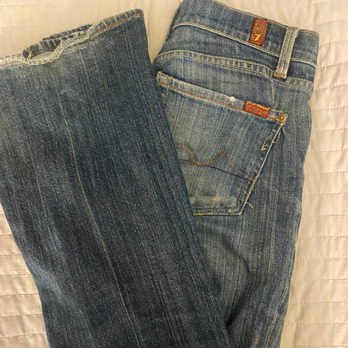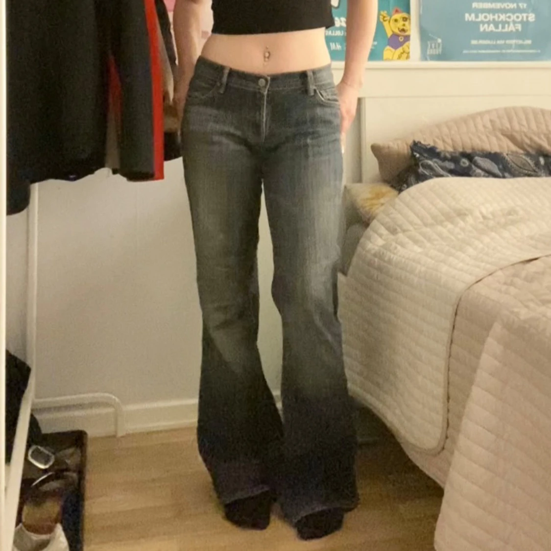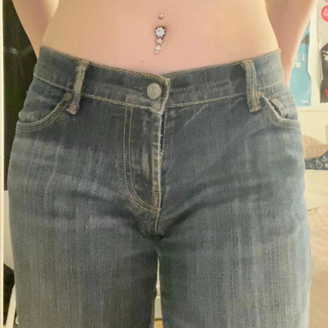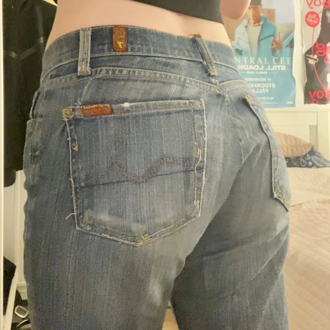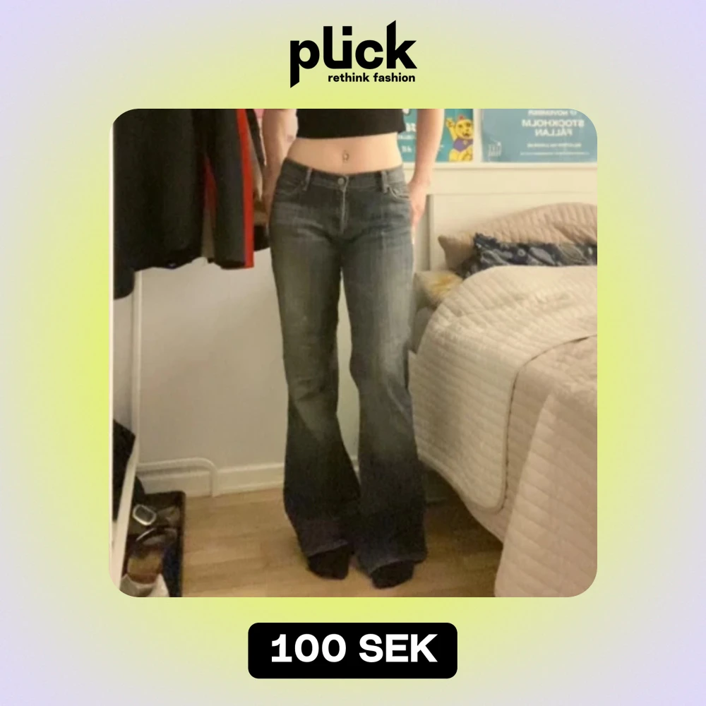 bootcut/baggyjeans, köpta second hand. Ngl de är ganska slitna, dragkedjan är trasig med slitningar längst ner och midjan har blivit insydd, så pris kan diskuteras. Jag är 156cm och brukar bära S. Skriv för mer bilder och mått🥰