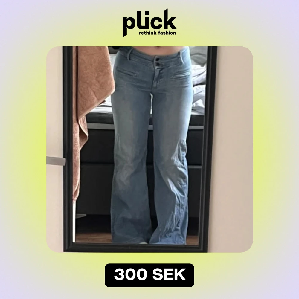 Jättefina ljusblåa jeans (vintage H&M), superbra skick! Storlek 38, bootcut/vid modell🙏🏼 Midjemått: 40 cm rakt över Innerbenslängd: 83 cm Bredd längst ner: 29 cm rakt över