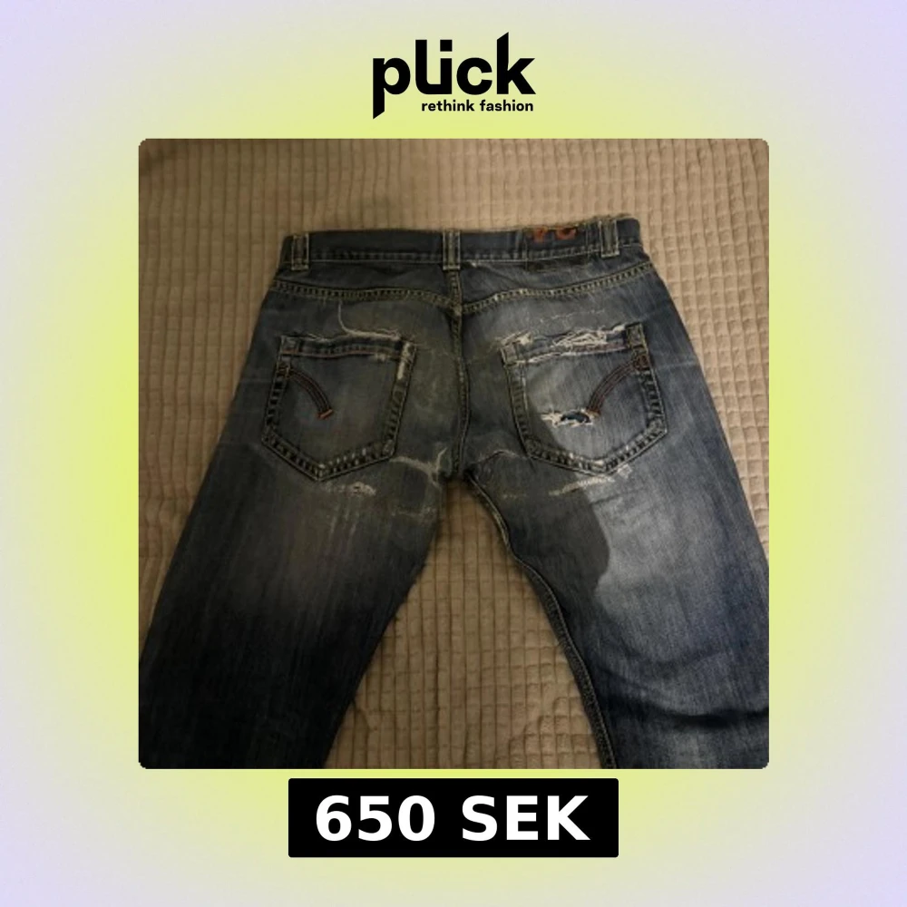 Säljer ett par blå jeans med coola slitningar och en klassisk femficksdesign. De har en knappgylf och är i en straight passform. Midjemått: 34 innreben: 95. Kan gå ner i pris!
