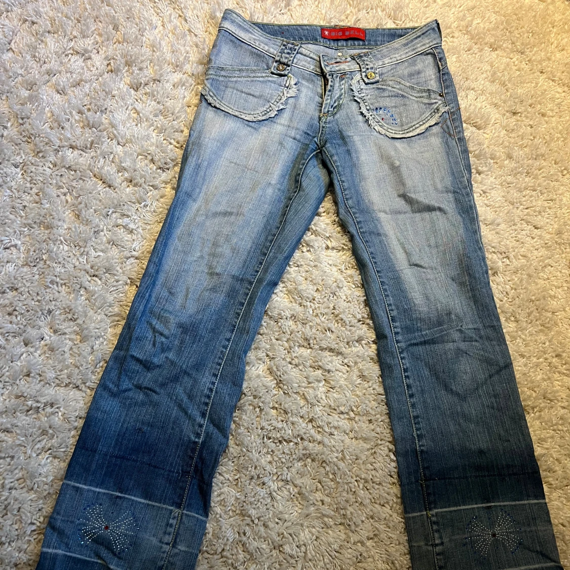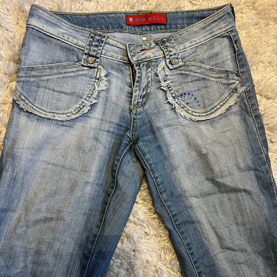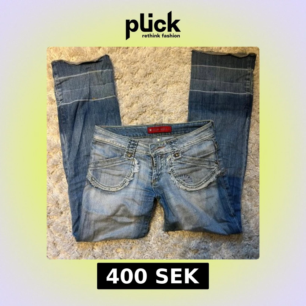 Snygga lågmidjade jeans med lösare modell (😍😍) och bootcut. Coola detaljer på både ficka och längts ner❤️ Passar storlek 36. Midjemåttet är 39 cm, innerbensmått 75