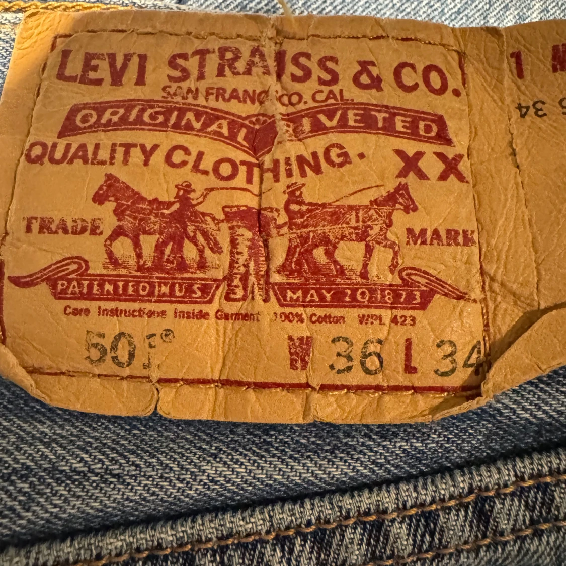Ett par Levis 501 i en finish som inte går att få tag på. ”Wash blue denim” ish. Från tidigt 2000-tal i toppen skick. Storlek 36/34, men passar 34/32 skulle ja säga.