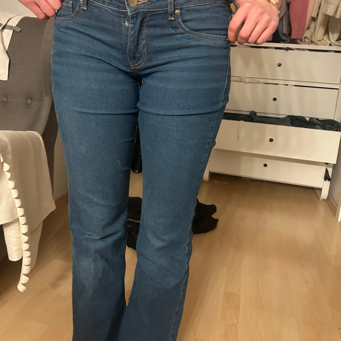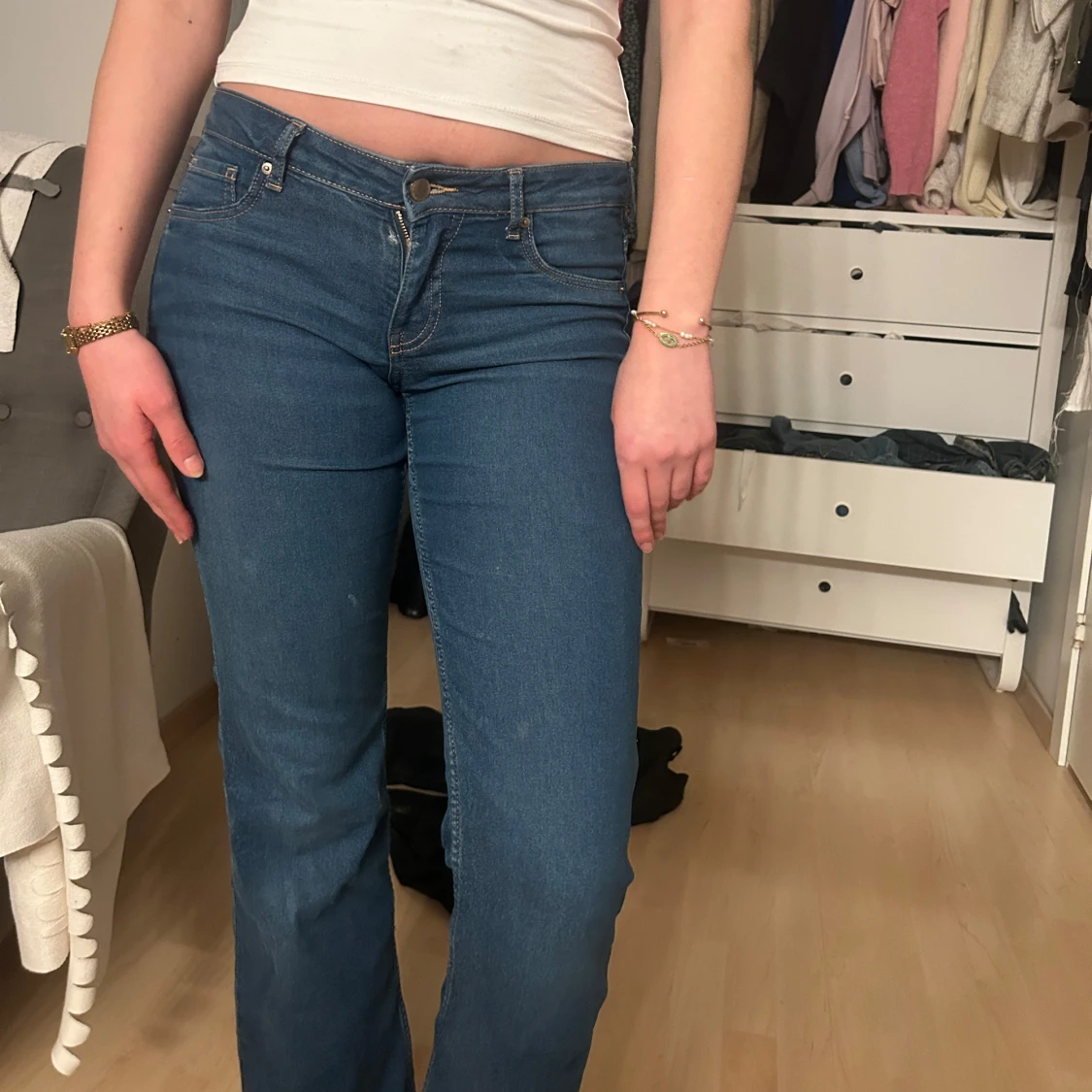 Snygga lågmidjade mörkblå jeans i storlek 36, använder inte längre men kommer såklart tvättas