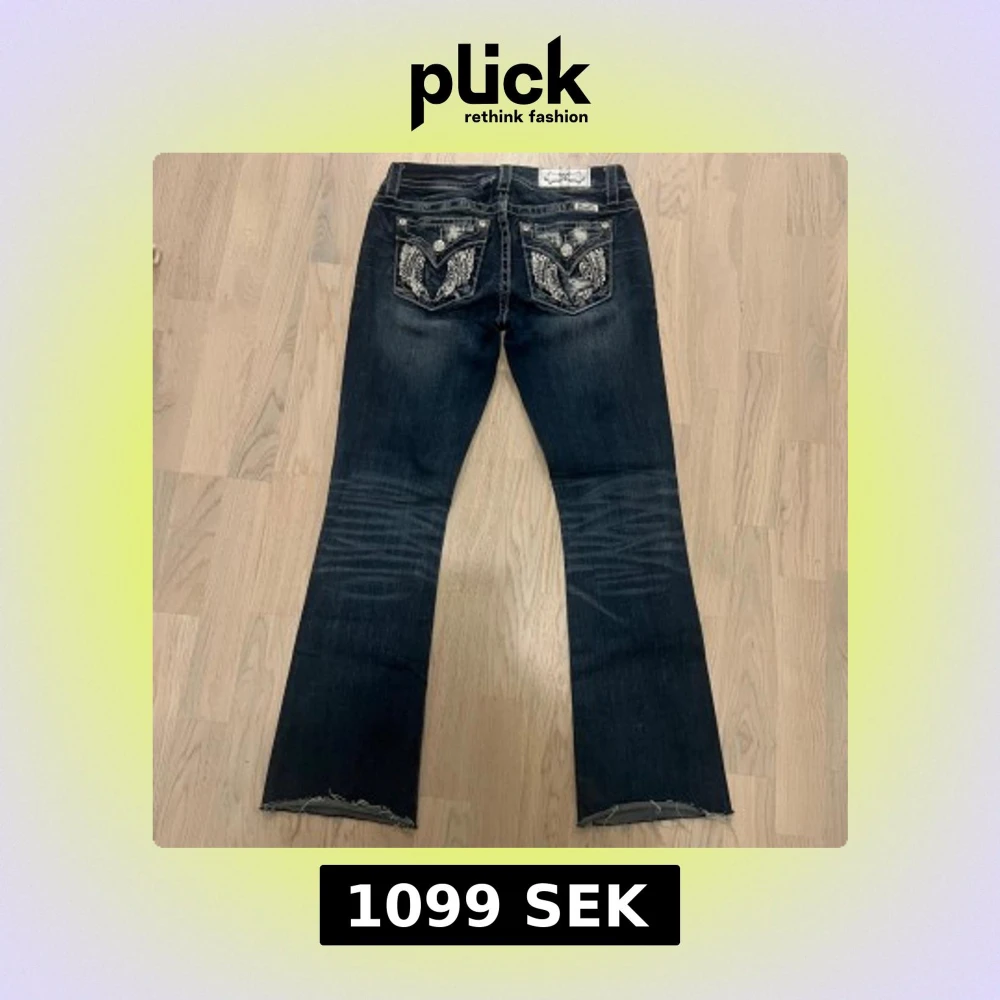 Mörkblå jeans från Miss Me med bootcut-modell och snygga slitningar. Bakfickorna har broderier och paljetter i silver, samt dekorativa knappar. Jeansen har kontrastsömmar och råa benslut för en edgy look.