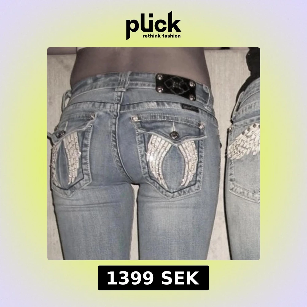 Snygga bootcut jeans från Miss Me med coola broderade vingar i silver på bakfickorna. Storlek 28 men små i storlek. Midjemått 35,5 cm innerbenslängd 84 cm 💓kolla min profil säljer fler miss me jeans!!🩵