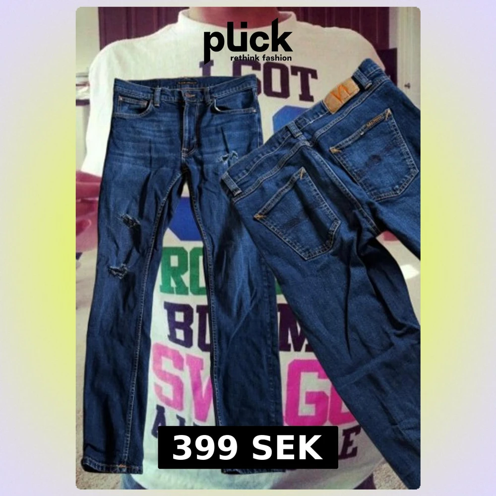 Säljer ett par mörkblå jeans från Nudie Jeans i storlek W29 L30. Klassisk femficksmodell med orangea sömmar och slitna detaljer på benen. Jeansen har rak passform och är tillverkade i robust denim med snygg tvätt.